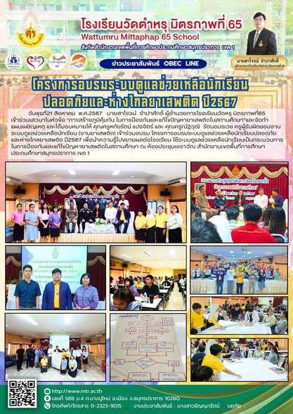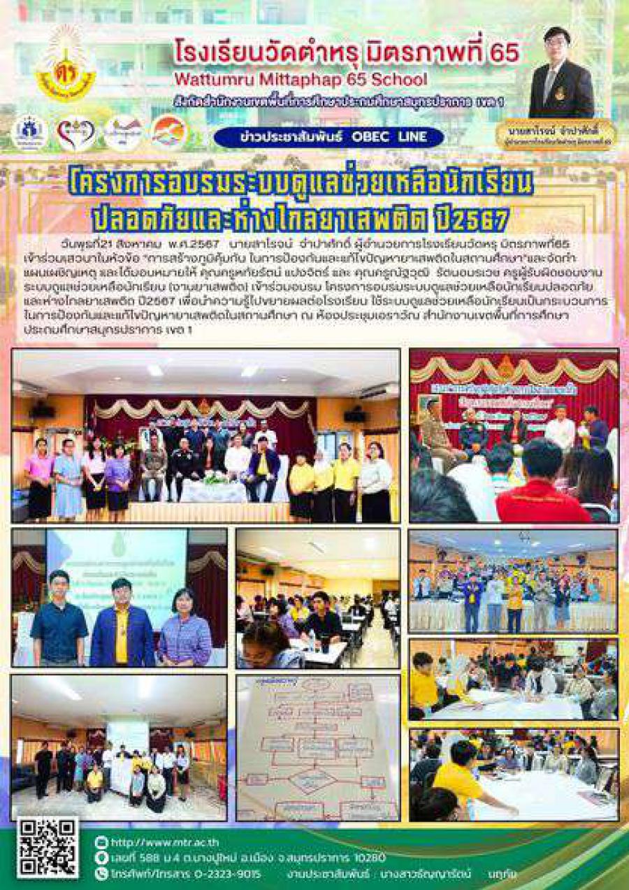 วันพุธที่21 สิงหาคม พ.ศ.2567 นายสาโรจน์ จำปาศักดิ์ ผู้อำนวยการโรงเรียนวัดหรุ มิตรภาพที่65เข้าร่วมเสวนาในหัวข้อ “การสร้างภูมิคุ้มกัน ในการป้องกันและแก้ไขปัญหายาเสพติดในสถานศึกษา”และจัดทำแผนเผชิญเหตุ และได้มอบหมายให้ คุณครูหทัยรัตน์ แปงจิตร์ และ คุณครูณัฐวุฒิ รัตนอมรเวช ครูผู้รับผิดชอบงานระบบดูแลช่วยเหลือนักเรียน (งานยาเสพติด) เข้าร่วมอบรม โครงการอบรมระบบดูแลช่วยเหลือนักเรียนปลอดภัยและห่างไกลยาเสพติด ปี2567 เพื่อนำความรู้ไปขยายผลต่อโรงเรียน ใช้ระบบดูแลช่วยเหลือนักเรียนเป็นกระบวนการในการป้องกันและแก้ไขปัญหายาเสพติดในสถานศึกษา ณ ห้องประชุมเอราวัณ สำนักงานเขตพื้นที่การศึกษาประถมศึกษาสมุทรปราการ เขต 1 https://www.facebook.com/share/p/dxS9JBswnyMvX4is/