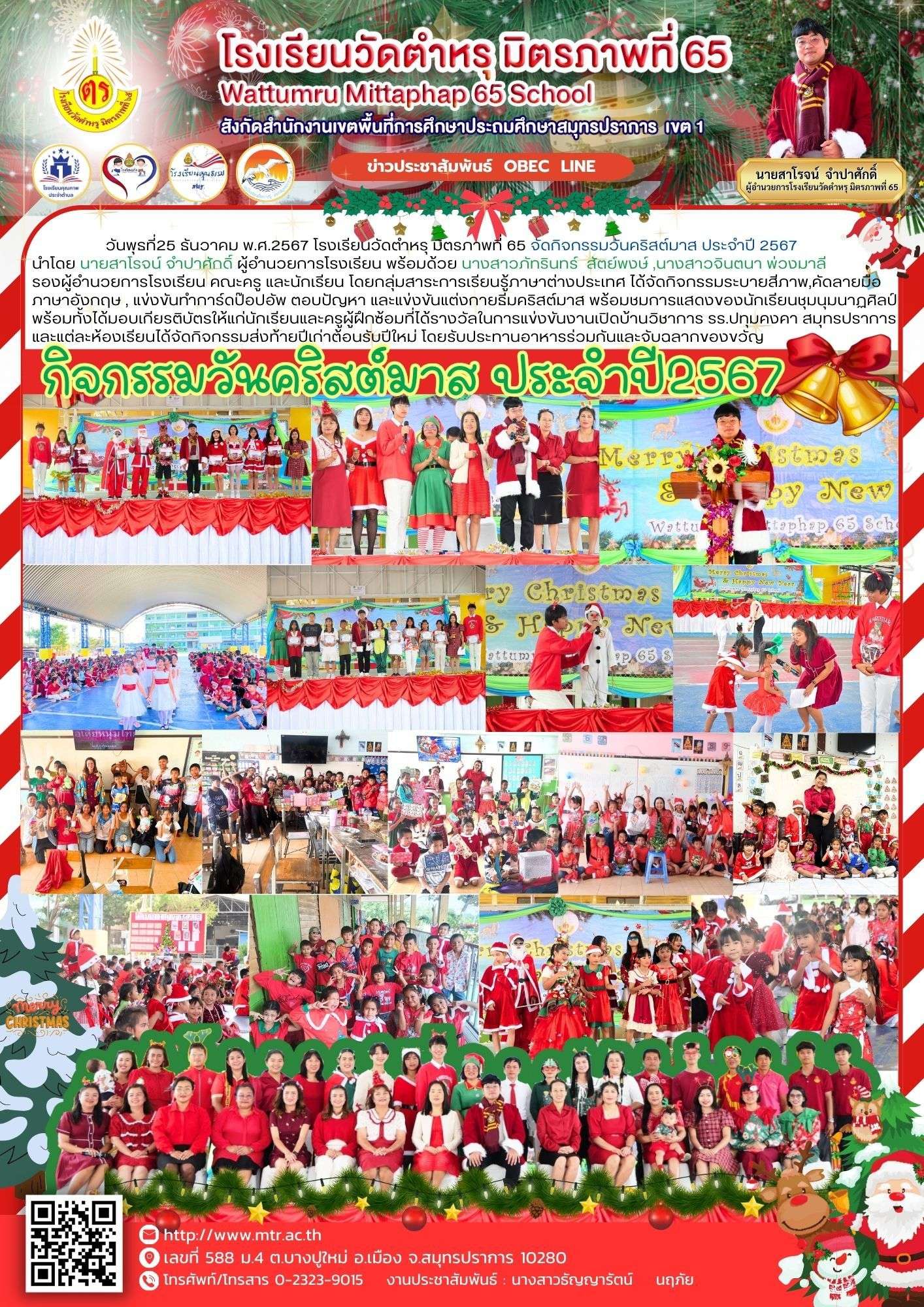 วันพุธที่25 ธันวาคม พ.ศ.2567 โรงเรียนวัดตําหรุ มิตรภาพที่ 65 จัดกิจกรรมวันคริสต์มาส ประจําปี 2567 นําโดย นายสาโรจน์ จําปาศักดิ์ ผู้อํานวยการโรงเรียน พร้อมด้วย นางสาวภัทรินทร์ สัตย์พงษ์,นางสาวจินตนา พ่วงมาลี รองผู้อํานวยการโรงเรียน คณะครู และนักเรียน โดยกลุ่มสาระการเรียนรู้ภาษาต่างประเทศ ได้จัดกิจกรรมระบายสีภาพ,คัดลายมือ ภาษาอังกฤษ, แข่งขันทําการ์ดป๊อปอัพ ตอบปัญหา และแข่งขันแต่งกายธีมคริสต์มาส พร้อมชมการแสดงของนักเรียนชุมนุมนาฏศิลป์ พร้อมทั้งได้มอบเกียรติบัตรให้แก่นักเรียนและครูผู้ฝึกซ้อมที่ได้รางวัลในการแข่งขันงานเปิดบ้านวิชาการ รร.ปทุมคงคา สมุทรปราการ และแต่ละห้องเรียนได้จัดกิจกรรมส่งท้ายปีเก่าต้อนรับปีใหม่ โดยรับประทานอาหารร่วมกันและจับฉลากของขวัญ
