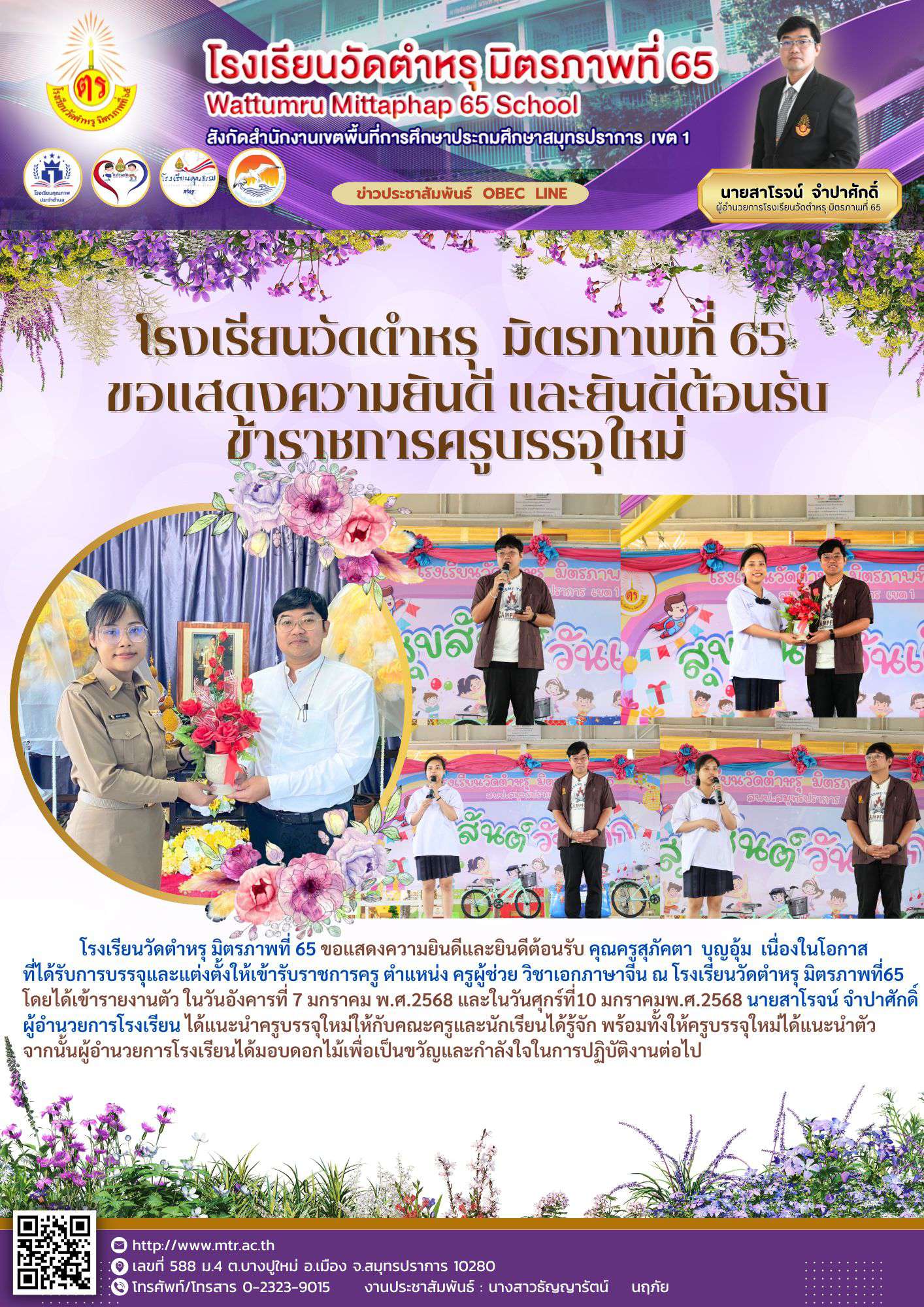 โรงเรียนวัดตำหรุ มิตรภาพที่ 65 ขอแสดงความยินดีและยินดีต้อนรับ คุณครูสุภัคตา บุญอุ้ม เนื่องในโอกาสที่ได้รับการบรรจุและแต่งตั้งให้เข้ารับราชการครู ตำแหน่ง ครูผู้ช่วย วิชาเอกภาษาจีน ณ โรงเรียนวัดตำหรุ มิตรภาพที่65 โดยได้เข้ารายงานตัว ในวันอังคารที่7 มกราคม พ.ศ.2568 และในวันศุกร์ที่10 มกราคมพ.ศ.2568 นายสาโรจน์ จำปาศักดิ์ ผู้อำนวยการโรงเรียน ได้แนะนำครูบรรจุใหม่ให้กับคณะครูและนักเรียนได้รู้จัก พร้อมทั้งให้ครูบรรจุใหม่ได้แนะนำตัว จากนั้นผู้อำนวยการโรงเรียนได้มอบดอกไม้เพื่อเป็นขวัญและกำลังใจในการปฏิบัติงานต่อไป