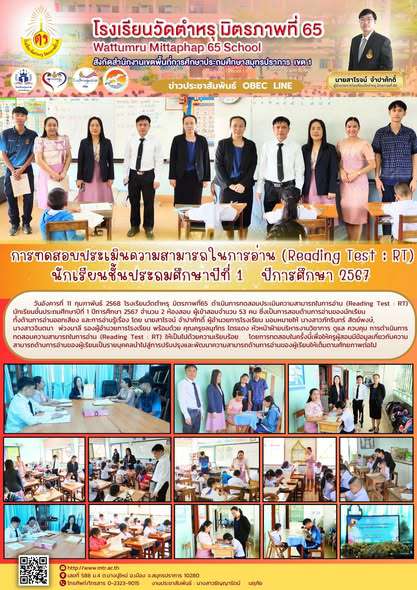 วันอังคารที่ 11 กุมภาพันธ์ 2568 โรงเรียนวัดตำหรุ มิตรภาพที่65 ดำเนินการทดสอบประเมินความสามารถในการอ่าน (Reading Test : RT) นักเรียนชั้นประถมศึกษาปีที่ 1 ปีการศึกษา 2567 จำนวน 2 ห้องสอบ ผู้เข้าสอบจำนวน 53 คน ซึ่งเป็นการสอบด้านการอ่านของนักเรียน ทั้งด้านการอ่านออกเสียง และการอ่านรู้เรื่อง โดย นายสาโรจน์ จำปาศักดิ์ ผู้อำนวยการโรงเรียน มอบหมายให้ นางสาวภัทรินทร์ สัตย์พงษ์,นางสาวจินตนา พ่วงมาลี รองผู้อำนวยการโรงเรียน พร้อมด้วย คุณครูชลนุภัทร ไตรแดง หัวหน้าฝ่ายบริหารงานวิชาการ ดูแล ควบคุม การดำเนินการทดสอบความสามารถในการอ่าน (Reading Test : RT) ให้เป็นไปด้วยความเรียบร้อย โดยการทดสอบในครั้งนี้เพื่อให้ครูผู้สอนมีข้อมูลเกี่ยวกับความสามารถด้านการอ่านของผู้เรียนเป็นรายบุคคลนำไปสู่การปรับปรุงและพัฒนาความสามารถด้านการอ่านของผู้เรียนให้เต็มตามศักยภาพต่อไป