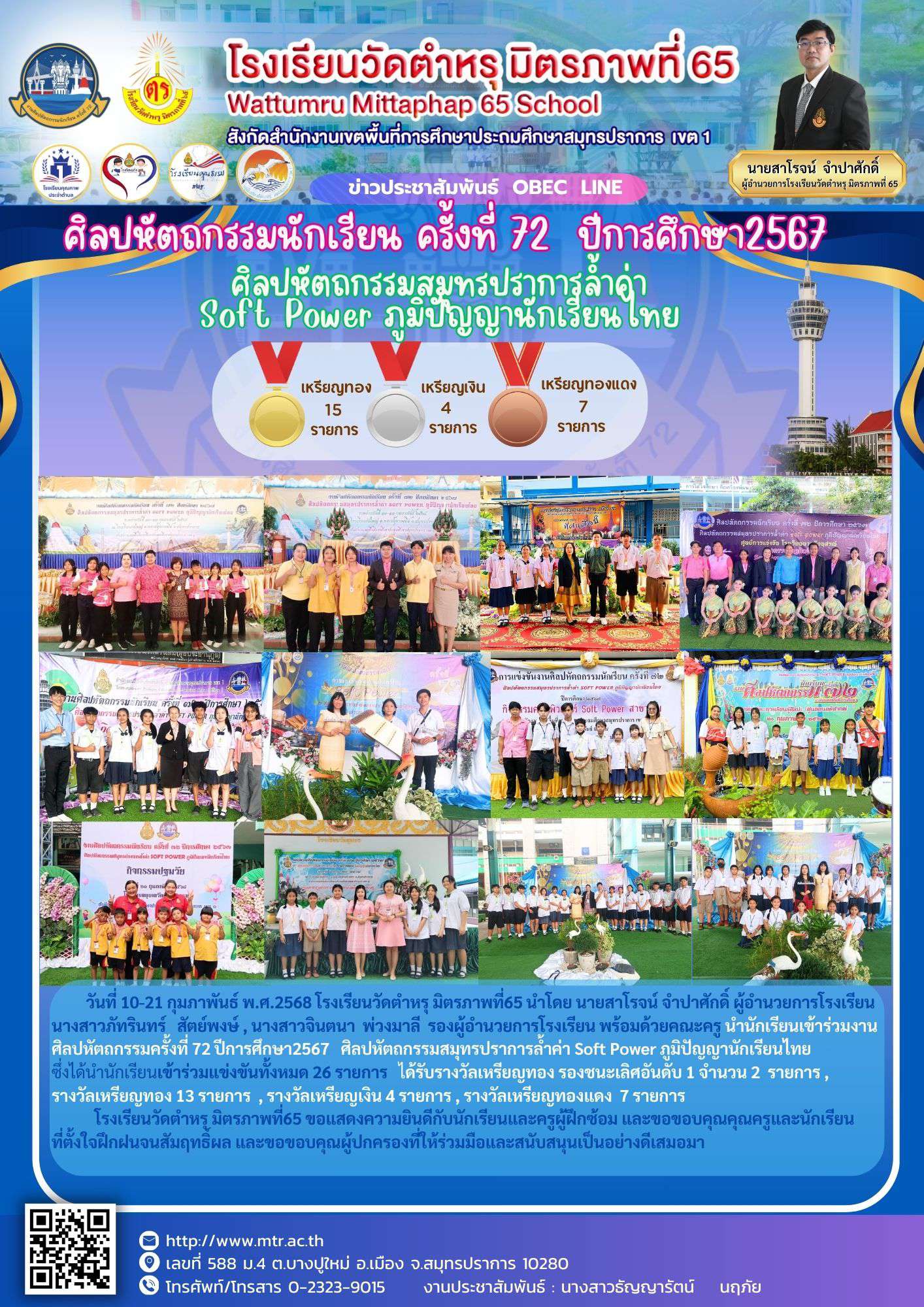 วันที่ 10-21 กุมภาพันธ์ พ.ศ.2568 โรงเรียนวัดตำหรุ มิตรภาพที่65 นำโดย นายสาโรจน์ จำปาศักดิ์ ผู้อำนวยการโรงเรียน นางสาวภัทรินทร์ สัตย์พงษ์ , นางสาวจินตนา พ่วงมาลี รองผู้อำนวยการโรงเรียน พร้อมด้วยคณะครู นำนักเรียนเข้าร่วมงานศิลปหัตถกรรมครั้งที่ 72 ปีการศึกษา2567 ศิลปหัตถกรรมสมุทรปราการล้ำค่า Soft Power ภูมิปัญญานักเรียนไทย ซึ่งได้นำนักเรียนเข้าร่วมแข่งขันทั้งหมด 26 รายการ ได้รับรางวัลเหรียญทอง รองชนะเลิศอันดับ 1 จำนวน 2 รายการ , รางวัลเหรียญทอง 13 รายการ , รางวัลเหรียญเงิน 4 รายการ , รางวัลเหรียญทองแดง 7 รายการ