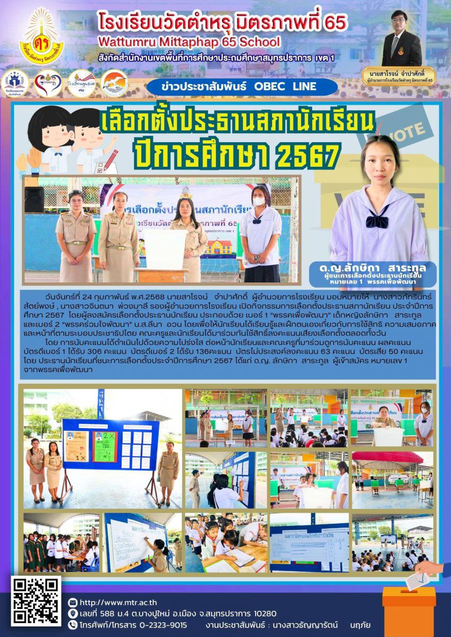 วันจันทร์ที่ 24 กุมภาพันธ์ พ.ศ.2568 นายสาโรจน์ จำปาศักดิ์ ผู้อำนวยการโรงเรียน มอบหมายให้ นางสาวภัทรินทร์ สัตย์พงษ์ , นางสาวจินตนา พ่วงมาลี รองผู้อำนวยการโรงเรียน เปิดกิจกรรมการเลือกตั้งประธานสภานักเรียน ประจำปีการศึกษา 2567 โดยผู้ลงสมัครเลือกตั้งประธานนักเรียน ประกอบด้วย เบอร์ 1 “พรรคเพื่อพัฒนา” เด็กหญิงลักษิกา สาระทูล และเบอร์ 2 “พรรคร่วมใจพัฒนา” น.ส.ลีนา อวน โดยเพื่อให้นักเรียนได้เรียนรู้และฝึกตนเองเกี่ยวกับการใช้สิทธิ ความเสมอภาคและหน้าที่ตามระบอบประชาธิปไตย คณะครูและนักเรียนได้มาร่วมกันใช้สิทธิ์ลงคะแนนเสียงเลือกตั้งตลอดทั้งวันโดย การนับคะแนนได้ดำเนินไปด้วยความโปร่งใส ต่อหน้านักเรียนและคณะครูที่มาร่วมดูการนับคะแนน ผลคะแนน บัตรดีเบอร์ 1 ได้รับ 306 คะแนน บัตรดีเบอร์ 2 ได้รับ 136คะแนน บัตรไม่ประสงค์ลงคะแนน 63 คะแนน บัตรเสีย 50 คะแนน โดย ประธานนักเรียนที่ชนะการเลือกตั้งประจำปีการศึกษา 2567 ได้แก่ ด.ญ. ลักษิกา สาระทูล ผู้เข้าสมัคร หมายเลข 1 จากพรรคเพื่อพัฒนา