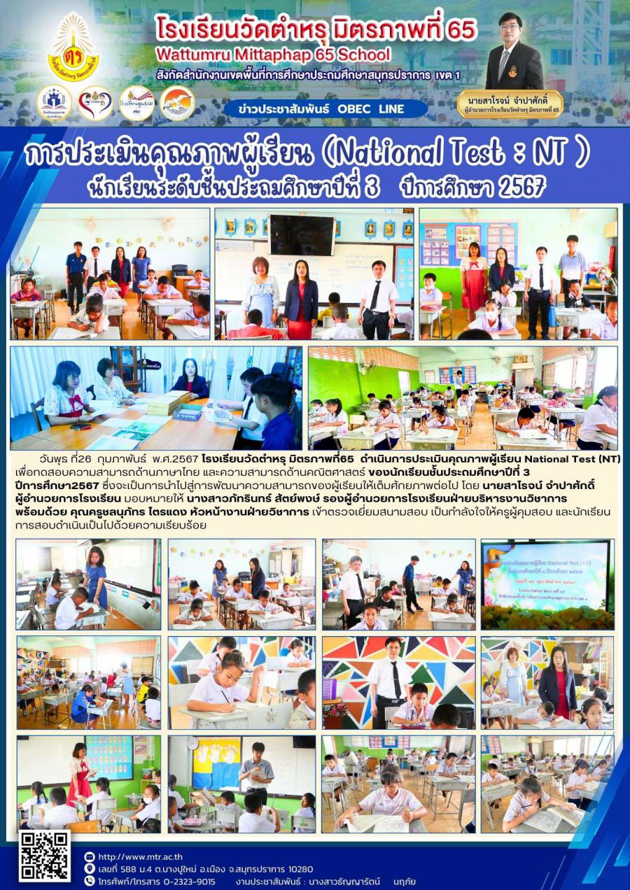 วันพุธ ที่26 กุมภาพันธ์ พ.ศ.2567 โรงเรียนวัดตำหรุ มิตรภาพที่65 ดำเนินการประเมินคุณภาพผู้เรียน National Test (NT) เพื่อทดสอบความสามารถด้านภาษาไทย และความสามารถด้านคณิตศาสตร์ ของนักเรียนชั้นประถมศึกษาปีที่ 3 ปีการศึกษา2567 ซึ่งจะเป็นการนำไปสู่การพัฒนาความสามารถของผู้เรียนให้เต็มศักยภาพต่อไป โดย นายสาโรจน์ จำปาศักดิ์ ผู้อำนวยการโรงเรียน มอบหมายให้ นางสาวภัทรินทร์ สัตย์พงษ์ รองผู้อำนวยการโรงเรียนฝ่ายบริหารงานวิชาการ พร้อมด้วย คุณครูชลนุภัทร ไตรแดง หัวหน้างานฝ่ายวิชาการ เข้าตรวจเยี่ยมสนามสอบ เป็นกำลังใจให้ครูผู้คุมสอบ และนักเรียน การสอบดำเนินเป็นไปด้วยความเรียบร้อย