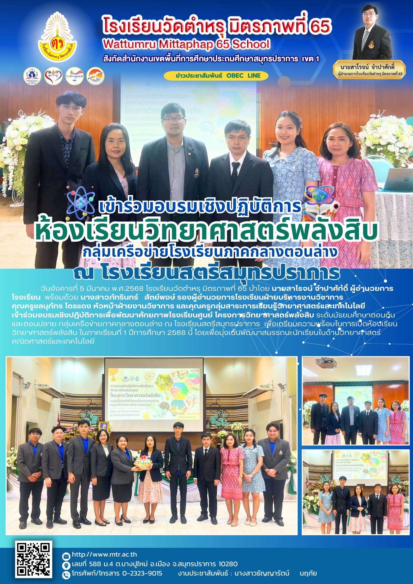 วันอังคารที่ 4 มีนาคม พ.ศ.2568 โรงเรียนวัดตำหรุ มิตรภาพที่ 65 นำโดย นายสาโรจน์ จำปาศักดิ์ ผู้อำนวยการโรงเรียน พร้อมด้วย นางสาวภัทรินทร์ สัตย์พงษ์ รองผู้อำนวยการโรงเรียนฝ่ายบริหารงานวิชาการ คุณครูชลนุภัทร ไตรแดง หัวหน้าฝ่ายงานวิชาการ และคุณครูกลุ่มสาระการเรียนรู้วิทยาศาสตร์และเทคโนโลยี เข้าร่วมอบรมเชิงปฏิบัติการเพื่อพัฒนาศักยภาพโรงเรียนศูนย์ โครงการวิทยาศาสตร์พลังสิบ ระดับมัธยมศึกษาตอนต้น และตอนปลาย กลุ่มเครือข่ายภาคกลางตอนล่าง ณ โรงเรียนสตรีสมุทรปราการ เพื่อเตรียมความพร้อมในการเปิดห้องเรียนวิทยาศาสตร์พลังสิบ ในภาคเรียนที่ 1 ปีการศึกษา 2568 นี้ โดยเพื่อมุ่งเน้นพัฒนาสมรรถนะนักเรียนในด้านวิทยาศาสตร์ คณิตศาสตร์และเทคโนโลยี