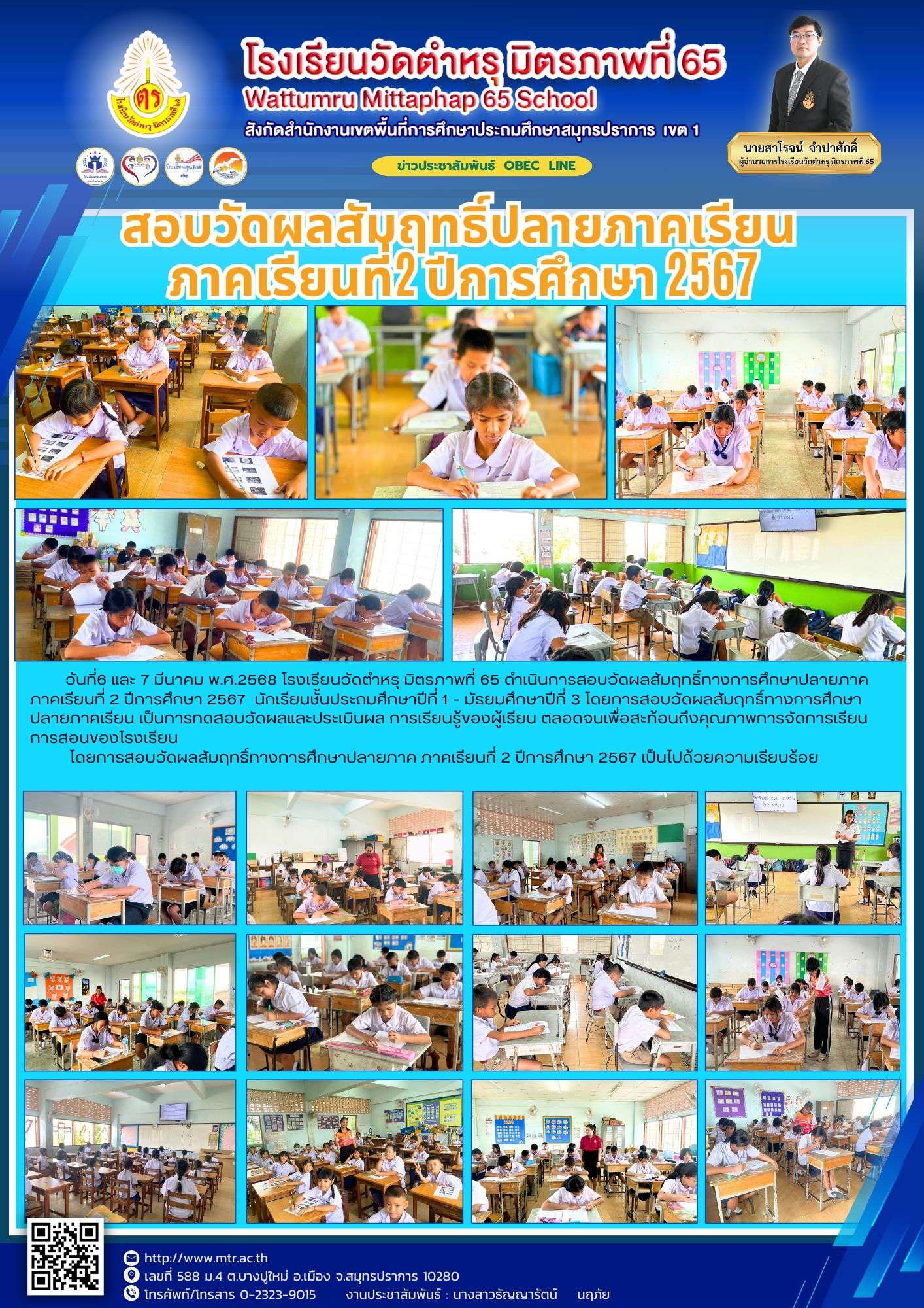 วันที่6 และ 7 มีนาคม พ.ศ.2568 โรงเรียนวัดตำหรุ มิตรภาพที่ 65 ดำเนินการสอบวัดผลสัมฤทธิ์ทางการศึกษาปลายภาค ภาคเรียนที่ 2 ปีการศึกษา 2567 นักเรียนชั้นประถมศึกษาปีที่ 1 - มัธยมศึกษาปีที่ 3 โดยการสอบวัดผลสัมฤทธิ์ทางการศึกษาปลายภาคเรียน เป็นการทดสอบวัดผลและประเมินผล การเรียนรู้ของผู้เรียน ตลอดจนเพื่อสะท้อนถึงคุณภาพการจัดการเรียนการสอนของโรงเรียน