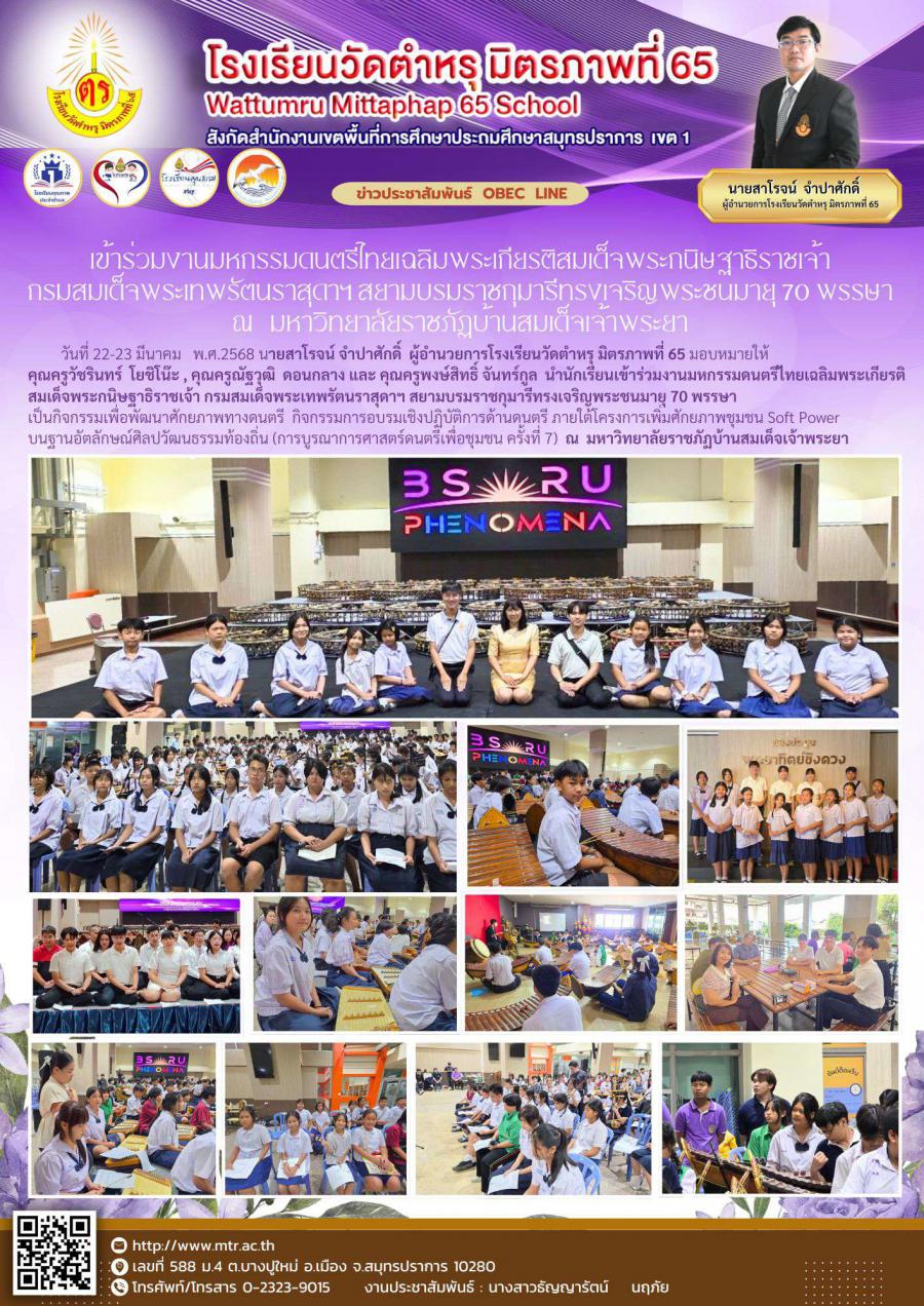 วันที่ 22-23 มีนาคม พ.ศ.2568 นายสาโรจน์ จำปาศักดิ์ ผู้อำนวยการโรงเรียนวัดตำหรุ มิตรภาพที่ 65 มอบหมายให้คุณครูวัชรินทร์ โยชิโน๊ะ , คุณครูณัฐวุฒิ ดอนกลาง และ คุณครูพงษ์สิทธิ์ จันทร์กูล นำนักเรียนเข้าร่วมงานมหกรรมดนตรีไทยเฉลิมพระเกียรติสมเด็จพระกนิษฐาธิราชเจ้า กรมสมเด็จพระเทพรัตนราสุดาฯ สยามบรมราชกุมารีทรงเจริญพระชนมายุ 70 พรรษา เป็นกิจกรรมเพื่อพัฒนาศักยภาพทางดนตรี กิจกรรมการอบรมเชิงปฏิบัติการด้านดนตรี ภายใต้โครงการเพิ่มศักยภาพชุมชน Soft Power บนฐานอัตลักษณ์ศิลปวัฒนธรรมท้องถิ่น (การบูรณาการศาสตร์ดนตรีเพื่อชุมชน ครั้งที่ 7) ณ มหาวิทยาลัยราชภัฏบ้านสมเด็จเจ้าพระยา