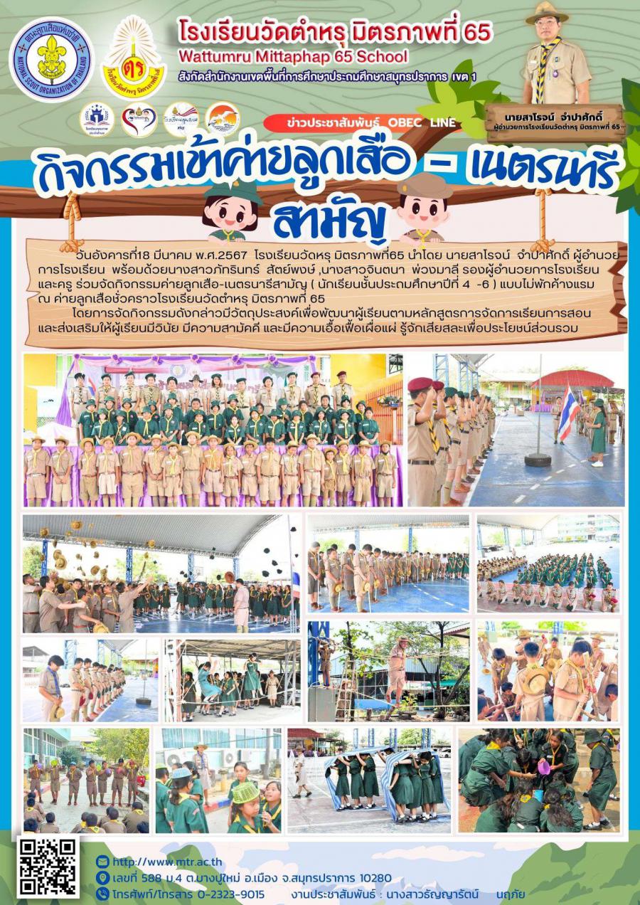วันอังคารที่18 มีนาคม พ.ศ.2568 โรงเรียนวัดหรุ มิตรภาพที่65 นำโดย นายสาโรจน์ จำปาศักดิ์ ผู้อำนวยการโรงเรียน พร้อมด้วยนางสาวภัทรินทร์ สัตย์พงษ์ ,นางสาวจินตนา พ่วงมาลี รองผู้อำนวยการโรงเรียน และครู ร่วมจัดกิจกรรมค่ายลูกเสือ-เนตรนารีสามัญ ( นักเรียนชั้นประถมศึกษาปีที่ 4 -6 ) แบบไม่พักค้างแรม ณ ค่ายลูกเสือชั่วคราวโรงเรียนวัดตำหรุ มิตรภาพที่ 65 โดยการจัดกิจกรรมดังกล่าวมีวัตถุประสงค์เพื่อพัฒนาผู้เรียนตามหลักสูตรการจัดการเรียนการสอน และส่งเสริมให้ผู้เรียนมีวินัย มีความสามัคคี และมีความเอื้อเฟื้อเผื่อแผ่ รู้จักเสียสละเพื่อประโยชน์ส่วนรวม