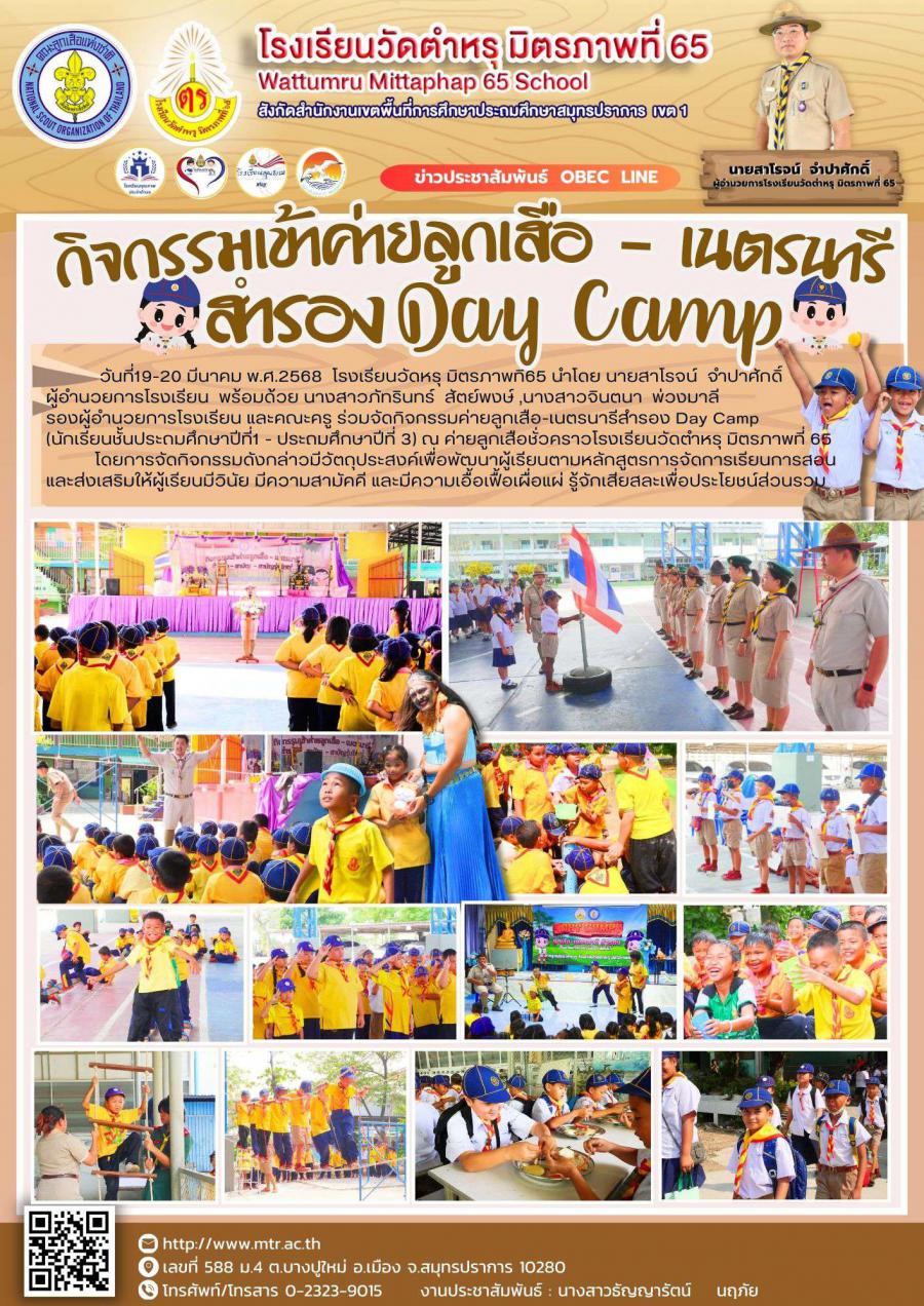 วันที่19-20 มีนาคม พ.ศ.2568 โรงเรียนวัดหรุ มิตรภาพที่65 นำโดย นายสาโรจน์ จำปาศักดิ์ ผู้อำนวยการโรงเรียน พร้อมด้วย นางสาวภัทรินทร์ สัตย์พงษ์ ,นางสาวจินตนา พ่วงมาลี รองผู้อำนวยการโรงเรียน และคณะครู ร่วมจัดกิจกรรมค่ายลูกเสือ-เนตรนารีสำรอง Day Camp (นักเรียนชั้นประถมศึกษาปีที่1 - ประถมศึกษาปีที่ 3) ณ ค่ายลูกเสือชั่วคราวโรงเรียนวัดตำหรุ มิตรภาพที่ 65 โดยการจัดกิจกรรมดังกล่าวมีวัตถุประสงค์เพื่อพัฒนาผู้เรียนตามหลักสูตรการจัดการเรียนการสอน และส่งเสริมให้ผู้เรียนมีวินัย มีความสามัคคี และมีความเอื้อเฟื้อเผื่อแผ่ รู้จักเสียสละเพื่อประโยชน์ส่วนรวม