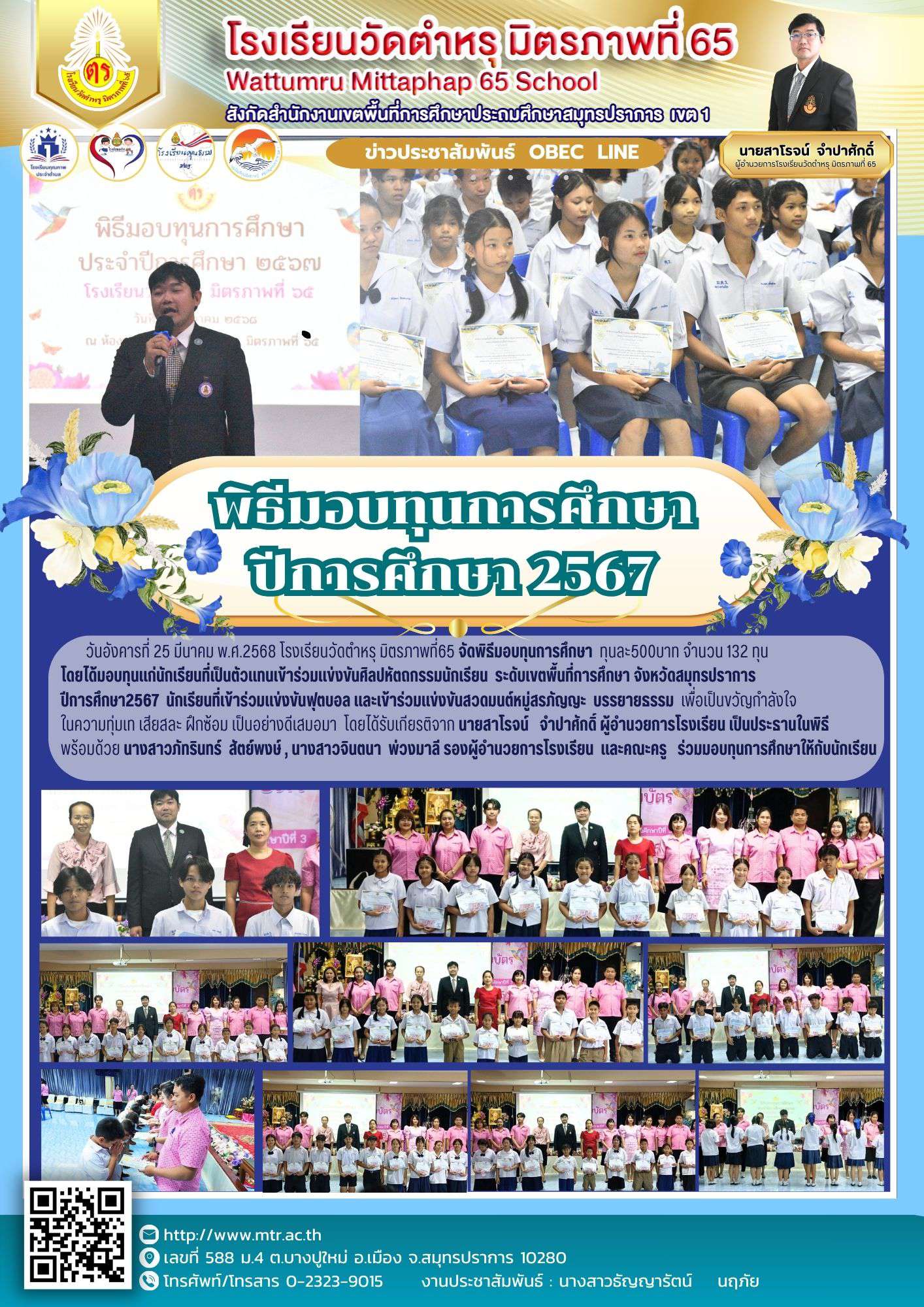 วันอังคารที่ 25 มีนาคม พ.ศ.2568 โรงเรียนวัดตำหรุ มิตรภาพที่65 จัดพิธีมอบทุนการศึกษา ทุนละ500บาท จำนวน 132 ทุน โดยได้มอบทุนแก่นักเรียนที่เป็นตัวแทนเข้าร่วมแข่งขันศิลปหัตถกรรมนักเรียน ระดับเขตพื้นที่การศึกษา จังหวัดสมุทรปราการ ปีการศึกษา2567 นักเรียนที่เข้าร่วมแข่งขันฟุตบอล และเข้าร่วมแข่งขันสวดมนต์หมู่สรภัญญะ บรรยายธรรม เพื่อเป็นขวัญกำลังใจในความทุ่มเท เสียสละ ฝึกซ้อม เป็นอย่างดีเสมอมา โดยได้รับเกียรติจาก นายสาโรจน์ จำปาศักดิ์ ผู้อำนวยการโรงเรียน เป็นประธานในพิธี พร้อมด้วย นางสาวภัทรินทร์ สัตย์พงษ์ , นางสาวจินตนา พ่วงมาลี รองผู้อำนวยการโรงเรียน และคณะครู ร่วมมอบทุนการศึกษาให้กับนักเรียน