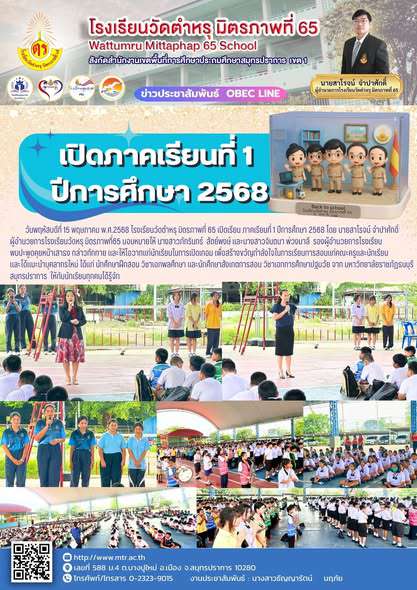 วันพฤหัสบดีที่ 15 พฤษภาคม พ.ศ.2568 โรงเรียนวัดตำหรุ มิตรภาพที่ 65 เปิดเรียน ภาคเรียนที่ 1 ปีการศึกษา 2568 โดย นายสาโรจน์ จำปาศักดิ์ ผู้อำนวยการโรงเรียนวัดหรุ มิตรภาพที่65 มอบหมายให้ นางสาวภัทรินทร์ สัตย์พงษ์ และนางสาวจินตนา พ่วงมาลี รองผู้อำนวยการโรงเรียน พบปะพูดคุยหน้าเสาธง กล่าวทักทาย และให้โอวาทแก่นักเรียนในการเปิดเทอม เพื่อสร้างขวัญกำลังใจในการเรียนการสอนแก่คณะครูและนักเรียน และได้แนะนำบุคลากรใหม่ ได้แก่ นักศึกษาฝึกสอน วิชาเอกพลศึกษา และนักศึกษาสังเกตการสอน วิชาเอกการศึกษาปฐมวัย จาก มหาวิทยาลัยราชภัฏธนบุรี สมุทรปราการ ให้กับนักเรียนทุกคนได้รู้จัก