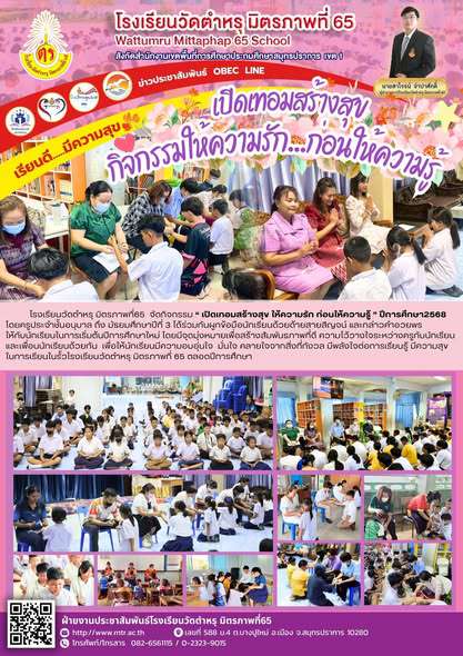 โรงเรียนวัดตำหรุ มิตรภาพที่65 จัดกิจกรรม “ เปิดเทอมสร้างสุข ให้ความรัก ก่อนให้ความรู้ ” ปีการศึกษา2568 โดยครูประจำชั้นอนุบาล ถึง มัธยมศึกษาปีที่ 3 ได้ร่วมกันผูกข้อมือนักเรียนด้วยด้ายสายสิญจน์ และกล่าวคำอวยพร ให้กับนักเรียนในการเริ่มต้นปีการศึกษาใหม่ โดยมีจุดมุ่งหมายเพื่อสร้างสัมพันธภาพที่ดี ความไว้วางใจระหว่างครูกับนักเรียน และเพื่อนนักเรียนด้วยกัน เพื่อให้นักเรียนมีความอบอุ่นใจ มั่นใจ คลายใจจากสิ่งที่กังวล มีพลังใจต่อการเรียนรู้ มีความสุขในการเรียนในรั้วโรงเรียนวัดตำหรุ มิตรภาพที่ 65 ตลอดปีการศึกษา