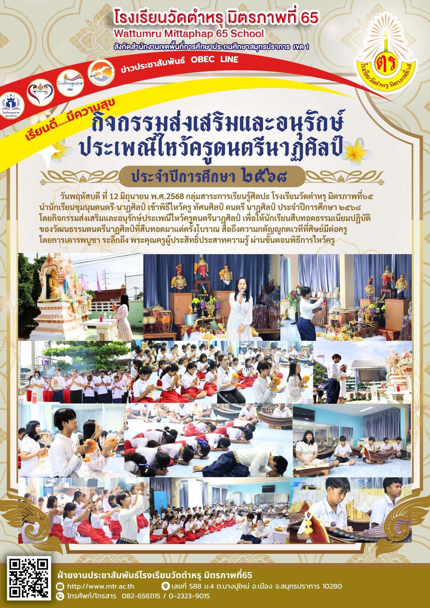 วันพฤหัสบดี ที่ 12 มิถุนายน พ.ศ.2568 กลุ่มสาระการเรียนรู้ศิลปะ โรงเรียนวัดตำหรุ มิตรภาพที่๖๕ นำนักเรียนชุมนุมดนตรี-นาฏศิลป์ เข้าพิธีไหว้ครู ทัศนศิลป์ ดนตรี นาฏศิลป์ ประจำปีการศึกษา ๒๕๖๘โดยกิจกรรมส่งเสริมและอนุรักษ์ประเพณีไหว้ครูดนตรีนาฏศิลป์ เพื่อให้นักเรียนสืบทอดธรรมเนียมปฏิบัติของวัฒนธรรมดนตรีนาฏศิลป์ที่สืบทอดมาแต่ครั้งโบราณ สื่อถึงความกตัญญูกตเวทีที่ศิษย์มีต่อครูโดยการเคารพบูชา ระลึกถึง พระคุณครูผู้ประสิทธิ์ประสาทความรู้ ผ่านขั้นตอนพิธีการไหว้ครู