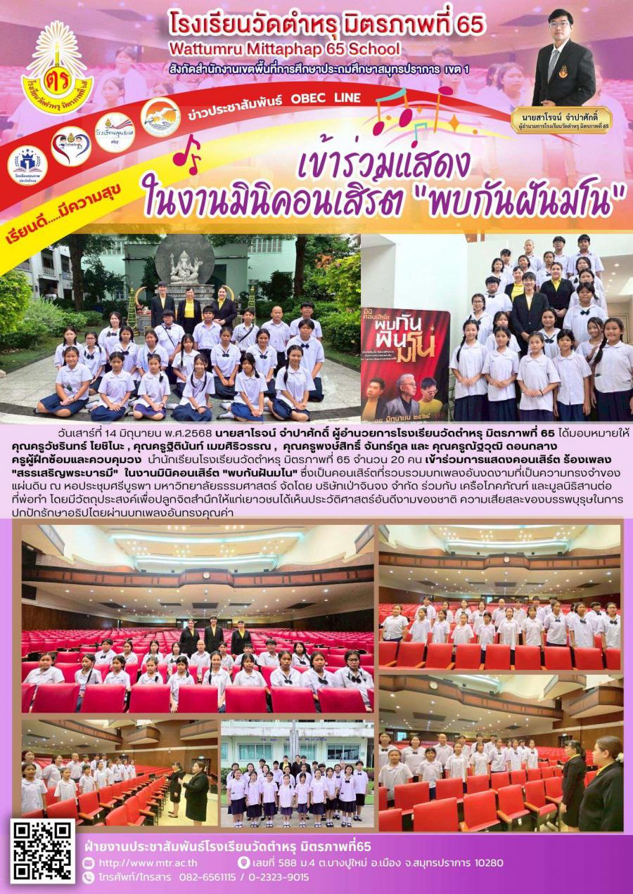 วันเสาร์ที่ 14 มิถุนายน พ.ศ.2568 นายสาโรจน์ จำปาศักดิ์ ผู้อำนวยการโรงเรียนวัดตำหรุ มิตรภาพที่ 65 ได้มอบหมายให้คุณครูวัชรินทร์ โยชิโนะ , คุณครูฐิตินันท์ เมฆศิริวรรณ , คุณครูพงษ์สิทธิ์ จันทร์กูล และ คุณครูณัฐวุฒิ ดอนกลางครูผู้ฝึกซ้อมและควบคุมวง นำนักเรียนโรงเรียนวัดตำหรุ มิตรภาพที่ 65 จำนวน 20 คน เข้าร่วมการแสดงคอนเสิร์ต ร้องเพลง "สรรเสริญพระบารมี" ในงานมินิคอนเสิร์ต "พบกันฝันมโน" ซึ่งเป็นคอนเสิร์ตที่รวบรวมบทเพลงอันงดงามที่เป็นความทรงจำของแผ่นดิน ณ หอประชุมศรีบูรพา มหาวิทยาลัยธรรมศาสตร์ จัดโดย บริษัทเป่าจินจง จำกัด ร่วมกับ เครือโภคภัณฑ์ และมูลนิธิสานต่อที่พ่อทำ โดยมีวัตถุประสงค์เพื่อปลูกจิตสำนึกให้แก่เยาวชนได้เห็นประวัติศาสตร์อันดีงามของชาติ ความเสียสละของบรรพบุรุษในการปกปักรักษาอธิปไตยผ่านบทเพลงอันทรงคุณค่า