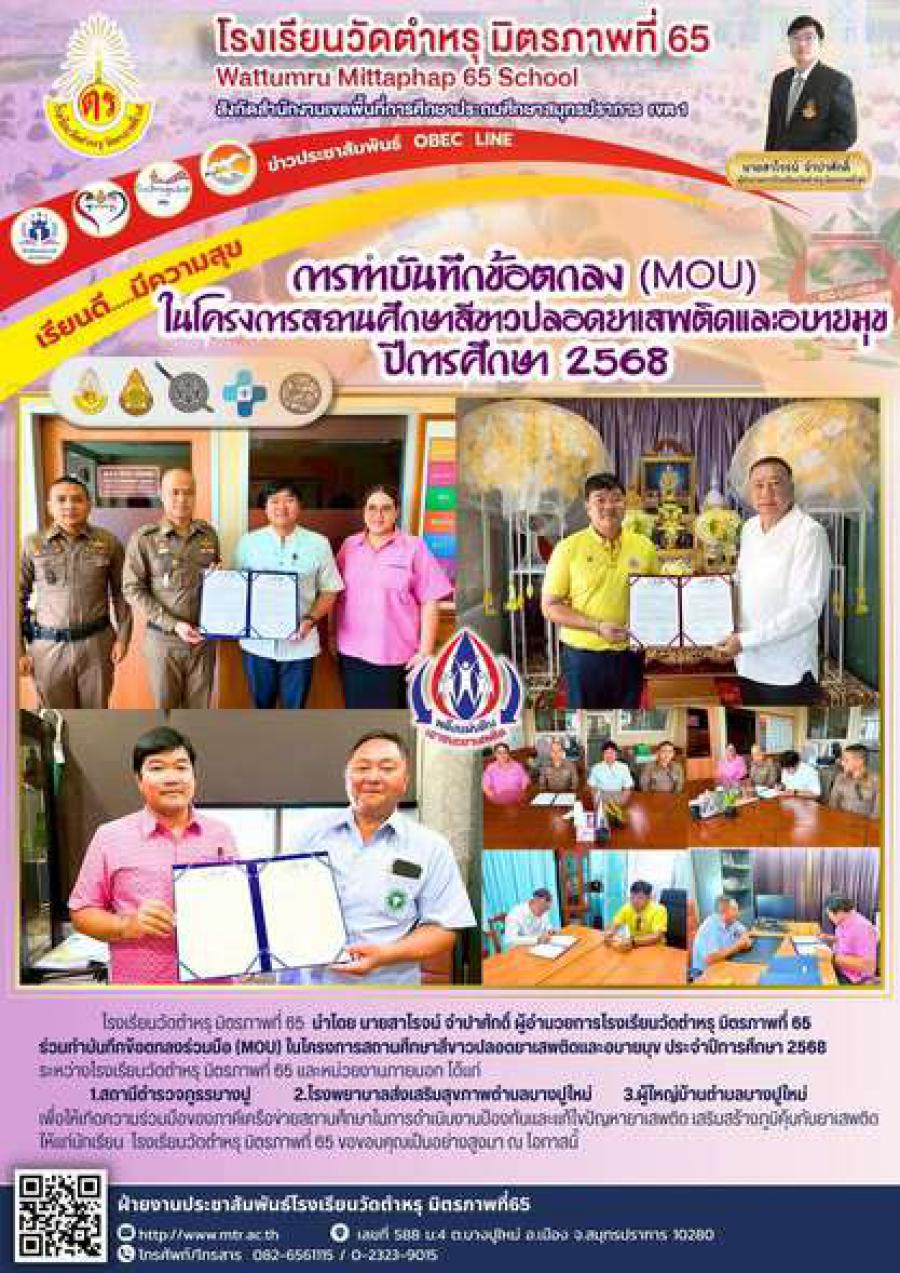 โรงเรียนวัดตำหรุ มิตรภาพที่ 65 นำโดย นายสาโรจน์ จำปาศักดิ์ ผู้อำนวยการโรงเรียน ร่วมทำบันทึกข้อตกลงร่วมมือ (MOU) ในโครงการสถานศึกษาสีขาวปลอดยาเสพติดและอบายมุข ประจำปีการศึกษา 2568 ระหว่างโรงเรียนวัดตำหรุ มิตรภาพที่ 65 และหน่วยงานภายนอก ได้แก่