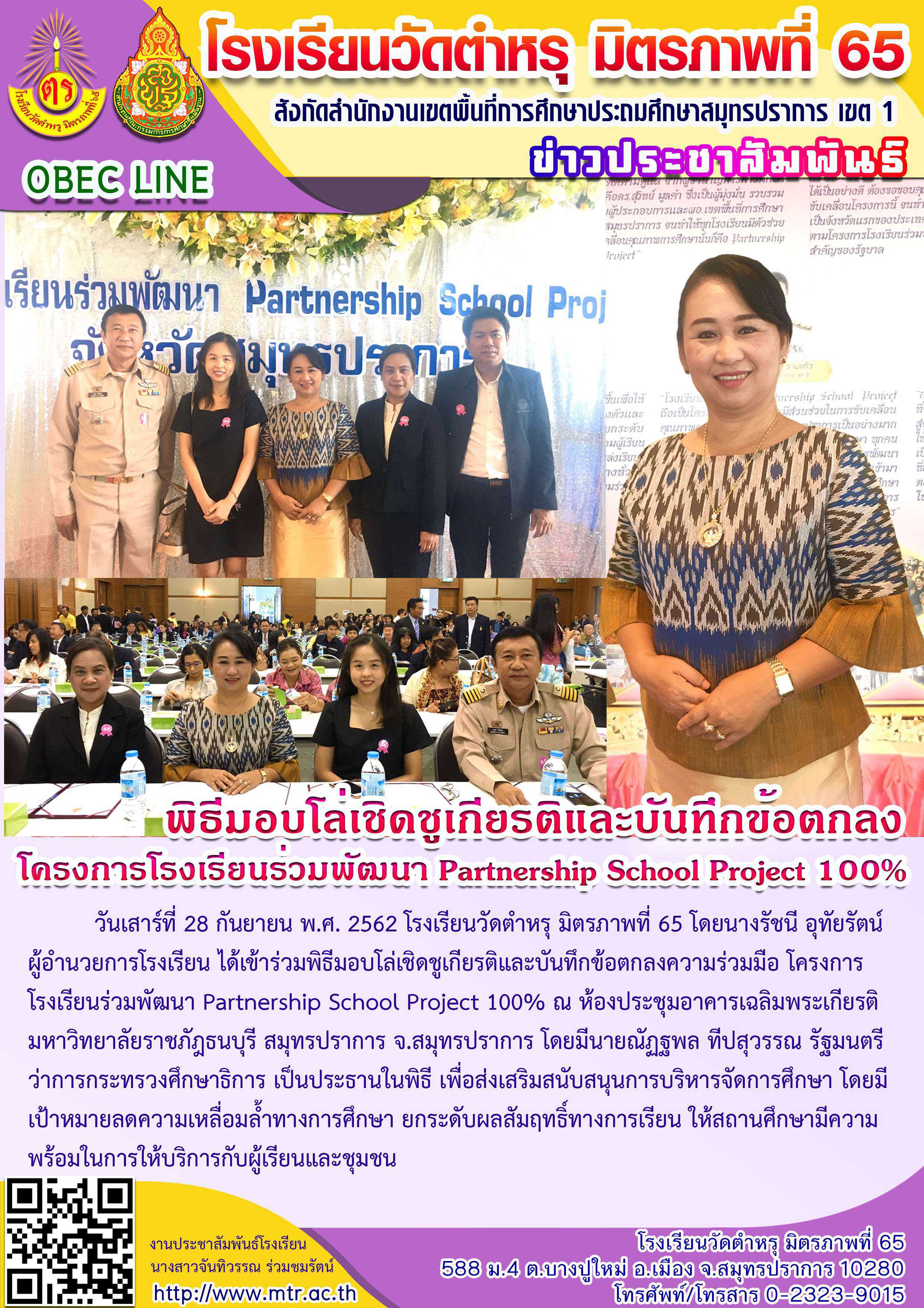 พิธีมอบโล่เชิดชูเกียรติและบันทึกข้อตกลง โครงการโรงเรียนร่วมพัฒนา Partnership School Project 100%