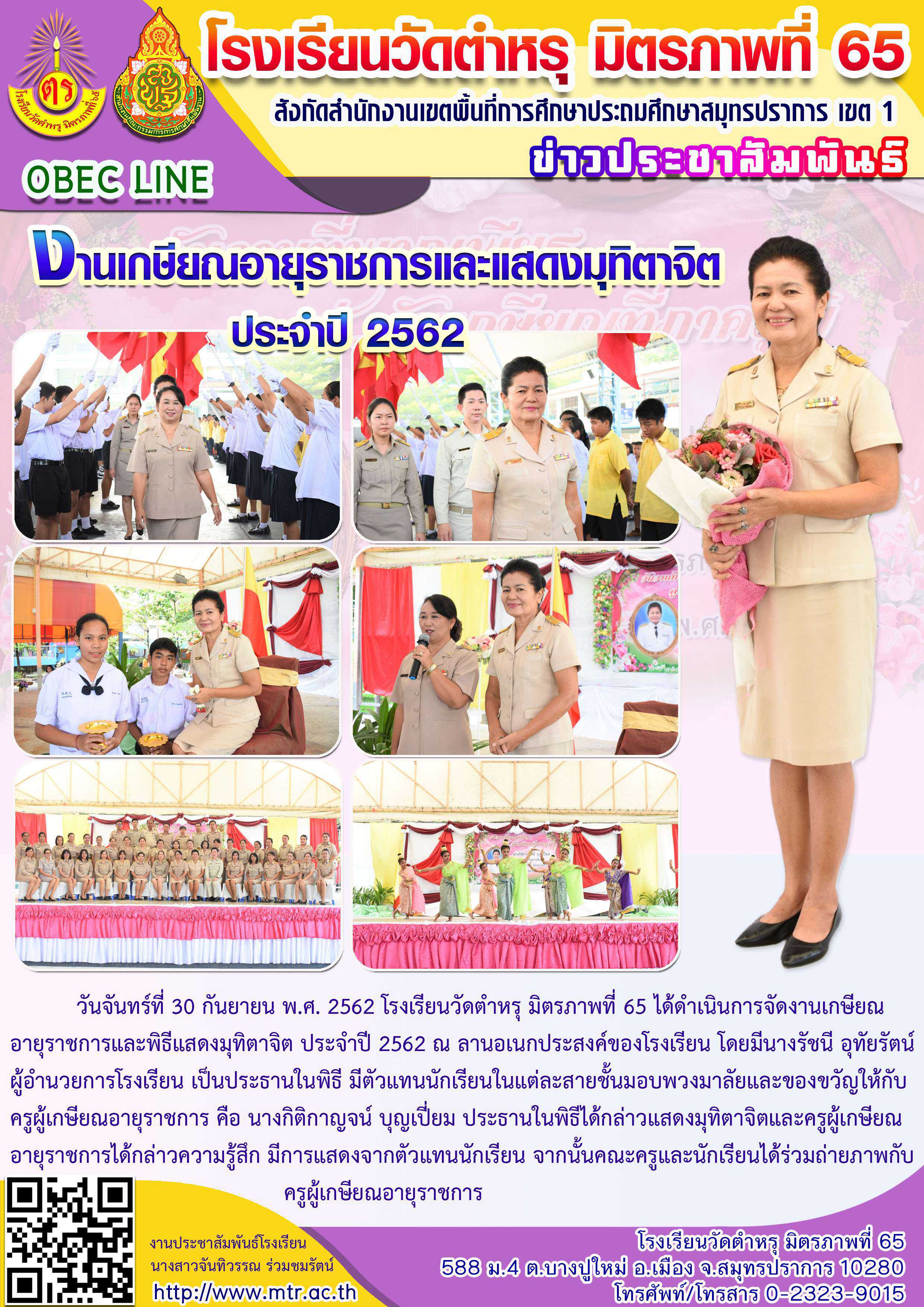 วันจันทร์ที่ 30 กันยายน พ.ศ. 2562 โรงเรียนวัดตำหรุ มิตรภาพที่ 65 ได้ดำเนินการจัดงานเกษียณอายุราชการและพิธีแสดงมุทิตาจิต ประจำปี 2562 ณ ลานอเนกประสงค์ของโรงเรียน โดยมีนางรัชนี อุทัยรัตน์ ผู้อำนวยการโรงเรียน เป็นประธานในพิธี มีตัวแทนนักเรียนในแต่ละสายชั้นมอบพวงมาลัยและของขวัญให้กับครูผู้เกษียณอายุราชการ คือ นางกิติกาญจน์ บุญเปี่ยม ประธานในพิธีได้กล่าวแสดงมุทิตาจิตและครูผู้เกษียณอายุราชการได้กล่าวความรู้สึก มีการแสดงจากตัวแทนนักเรียน จากนั้นคณะครูและนักเรียนได้ร่วมถ่ายภาพกับครูผู้เกษียณอายุราชการ
