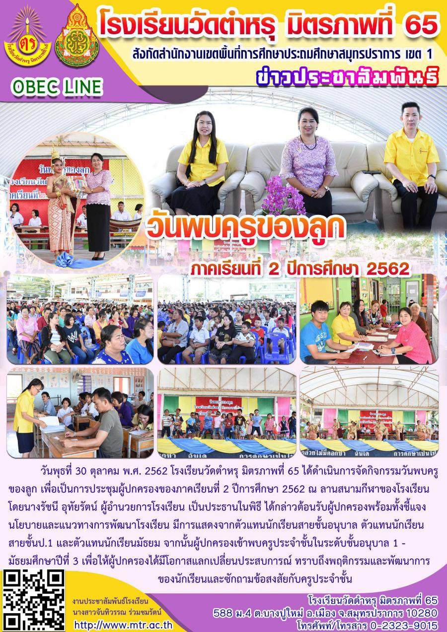 วันพุธที่ 30 ตุลาคม พ.ศ. 2562 โรงเรียนวัดตำหรุ มิตรภาพที่ 65 ได้ดำเนินการจัดกิจกรรมวันพบครูของลูก เพื่อเป็นการประชุมผู้ปกครองของภาคเรียนที่ 2 ปีการศึกษา 2562 ณ ลานสนามกีฬาของโรงเรียน โดยนางรัชนี อุทัยรัตน์ ผู้อำนวยการโรงเรียน เป็นประธานในพิธี ได้กล่าวต้อนรับผู้ปกครองพร้อมทั้งชี้แจงนโยบายและแนวทางการพัฒนาโรงเรียน มีการแสดงจากตัวแทนนักเรียนสายชั้นอนุบาล ตัวแทนนักเรียนสายชั้นป.1 และตัวแทนนักเรียนมัธยม จากนั้นผู้ปกครองเข้าพบครูประจำชั้นในระดับชั้นอนุบาล 1 - มัธยมศึกษาปีที่ 3 เพื่อให้ผู้ปกครองได้มีโอกาสแลกเปลี่ยนประสบการณ์ ทราบถึงพฤติกรรมและพัฒนาการของนักเรียนและซักถามข้อสงสัยกับครูประจำชั้น