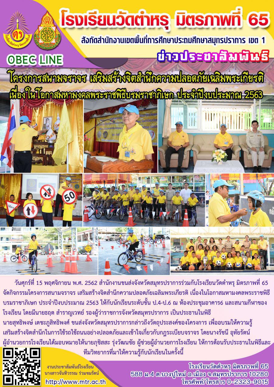 วันศุกร์ที่ 15 พฤศจิกายน พ.ศ. 2562 สำนักงานขนส่งจังหวัดสมุทรปราการร่วมกับโรงเรียนวัดตำหรุ มิตรภาพที่ 65 จัดกิจกรรมโครงการสนามจราจร เสริมสร้างจิตสำนึกความปลอดภัยเฉลิมพระเกียรติ เนื่องในโอกาสมหามงคลพระราชพิธีบรมราชาภิเษก ประจำปีงบประมาณ 2563 ให้กับนักเรียนระดับชั้น ป.4-ป.6 ณ ห้องประชุมอาคาร 6 และสนามกีฬาของโรงเรียน โดยมีนายธฤต สำราญเวทย์ รองผู้ว่าราชการจังหวัดสมุทรปราการ เป็นประธานในพิธี นายสุทธิพงษ์ เตชะภูสิทธิพงศ์ ขนส่งจังหวัดสมุทรปราการกล่าวถึงวัตถุประสงค์ของโครงการ เพื่ออบรมให้ความรู้ เสริมสร้างจิตสำนึกในการใช้รถใช้ถนนอย่างปลอดภัยและเข้าใจเกี่ยวกับกฎระเบียบจราจร โดยนางรัชนี อุทัยรัตน์ ผู้อำนวยการโรงเรียนได้มอบหมายให้นายภุชิสสะ รุ่งวัฒนชัย ผู้ช่วยผู้อำนวยการโรงเรียน ให้การต้อนรับประธานในพิธีและทีมวิทยากรที่มาให้ความรู้กับนักเรียนในครั้งนี้