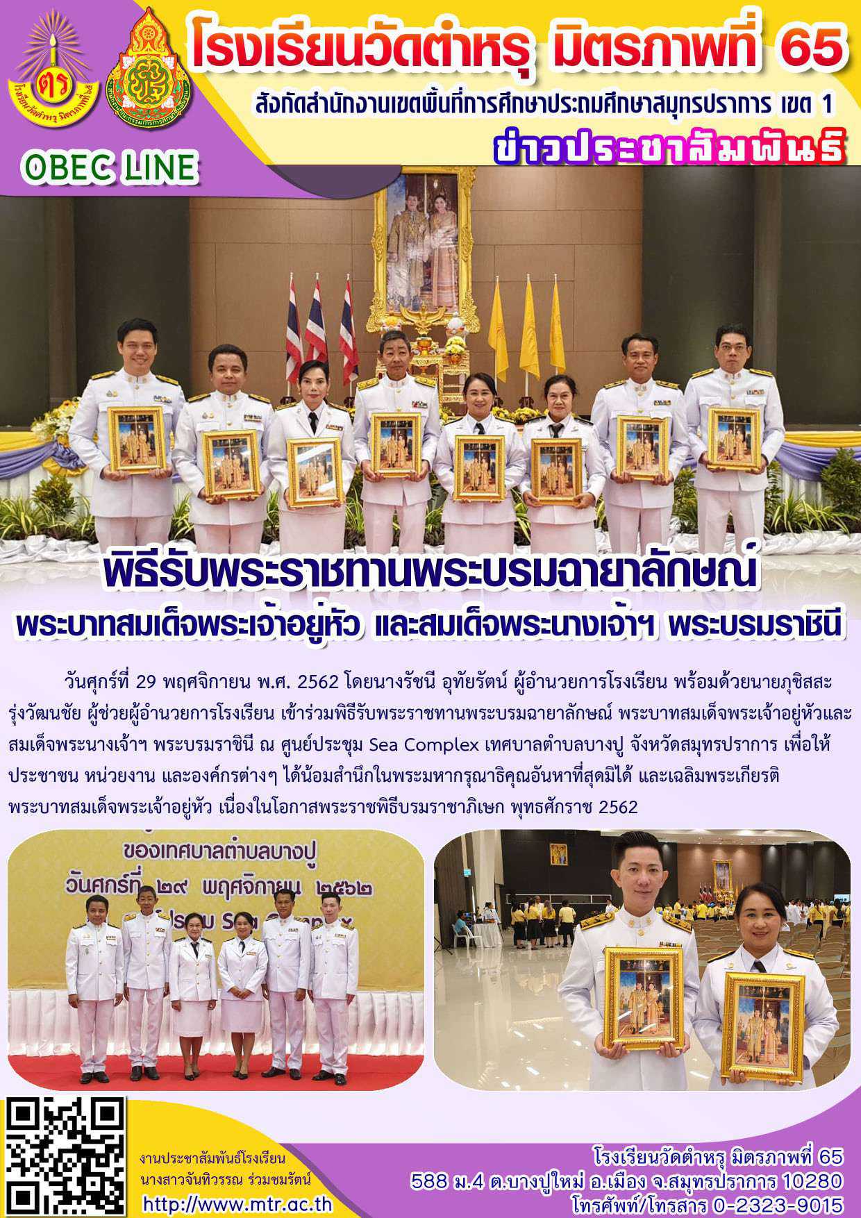 วันศุกร์ที่ 29 พฤศจิกายน พ.ศ. 2562 โดยนางรัชนี อุทัยรัตน์ ผู้อำนวยการโรงเรียน พร้อมด้วยนายภุชิสสะ รุ่งวัฒนชัย ผู้ช่วยผู้อำนวยการโรงเรียน เข้าร่วมพิธีรับพระราชทานพระบรมฉายาลักษณ์ พระบาทสมเด็จพระเจ้าอยู่หัวและสมเด็จพระนางเจ้าฯ พระบรมราชินี ณ ศูนย์ประชุม Sea Complex เทศบาลตำบลบางปู จังหวัดสมุทรปราการ เพื่อให้ประชาชน หน่วยงาน และองค์กรต่างๆ ได้น้อมสำนึกในพระมหากรุณาธิคุณอันหาที่สุดมิได้ และเฉลิมพระเกียรติพระบาทสมเด็จพระเจ้าอยู่หัว เนื่องในโอกาสพระราชพิธีบรมราชาภิเษก พุทธศักราช 2562