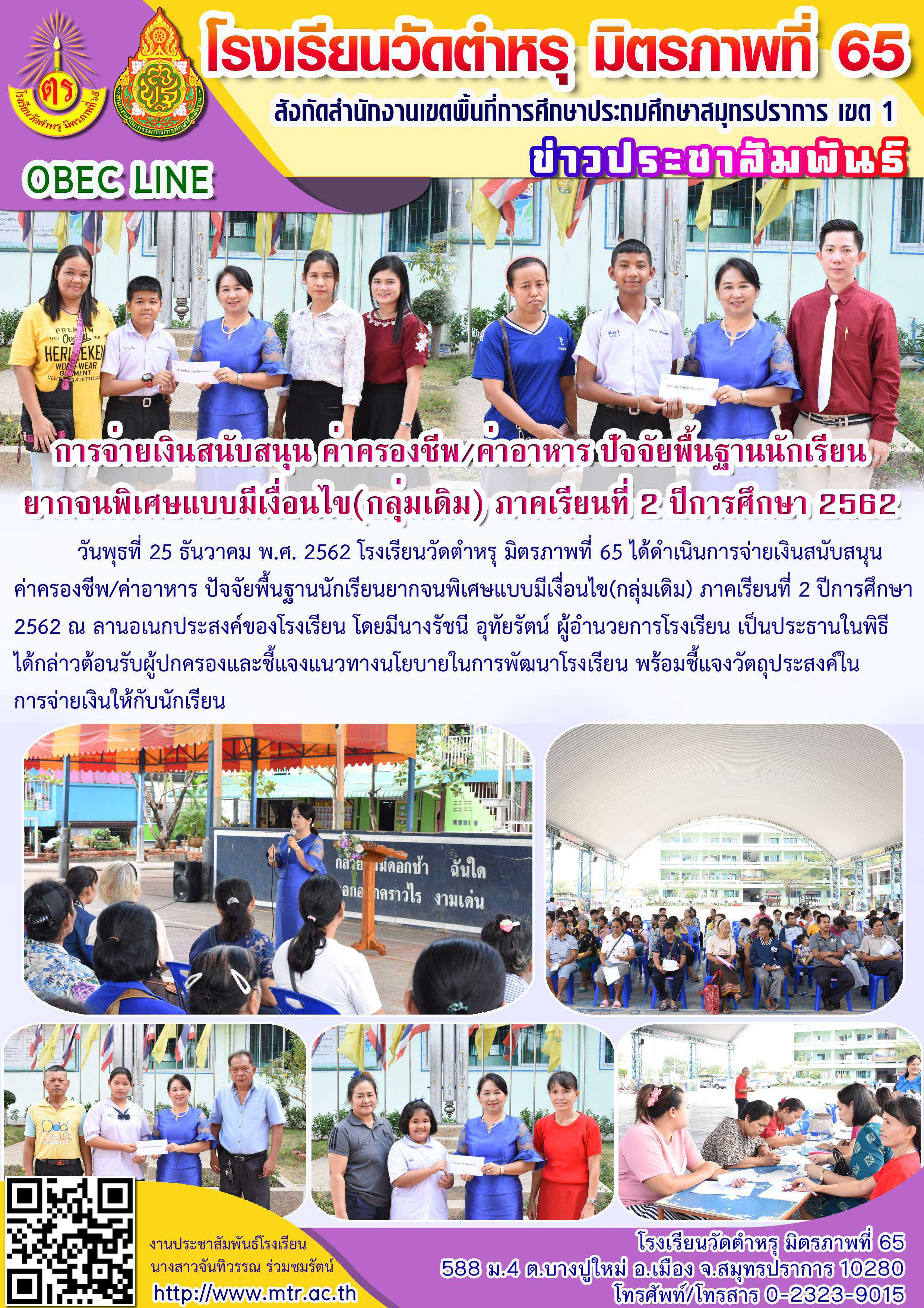 วันพุธที่ 25 ธันวาคม พ.ศ. 2562 โรงเรียนวัดตำหรุ มิตรภาพที่ 65 ได้ดำเนินการจ่ายเงินสนับสนุน ค่าครองชีพ/ค่าอาหาร ปัจจัยพื้นฐานนักเรียนยากจนพิเศษแบบมีเงื่อนไข(กลุ่มเดิม) ภาคเรียนที่ 2 ปีการศึกษา 2562 ณ ลานอเนกประสงค์ของโรงเรียน โดยมีนางรัชนี อุทัยรัตน์ ผู้อำนวยการโรงเรียน เป็นประธานในพิธี ได้กล่าวต้อนรับผู้ปกครองและชี้แจงแนวทางนโยบายในการพัฒนาโรงเรียน พร้อมชี้แจงวัตถุประสงค์ในการจ่ายเงินให้กับนักเรียน