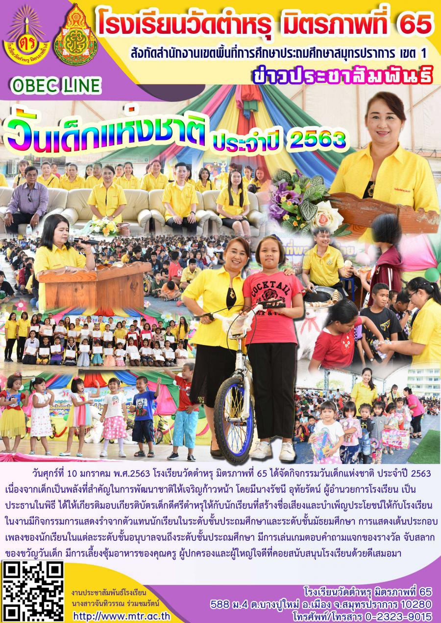 วันศุกร์ที่ 10 มกราคม พ.ศ. 2563 โรงเรียนวัดตำหรุ มิตรภาพที่ 65 ได้จัดกิจกรรมวันเด็กแห่งชาติประจำปี 2563 เนื่องจากเด็กเป็นพลังที่สำคัญในการพัฒนาชาติให้เจริญก้าวหน้า โดยมีนางรัชนี อุทัยรัตน์ ผู้อำนวยการโรงเรียน เป็นประธานในพิธี ได้ให้เกียรติมอบเกียรติบัตรเด็กดีศรีตำหรุให้กับนักเรียนที่สร้างชื่อเสียงและบำเพ็ญประโยชน์ให้กับโรงเรียน ในงานมีกิจกรรมการแสดงรำจากตัวแทนนักเรียนในระดับชั้นประถมศึกษาและระดับชั้นมัธยมศึกษา การแสดงเต้นประกอบเพลงของนักเรียนในแต่ละระดับชั้นอนุบาลจนถึงระดับชั้นประถมศึกษา มีการเล่นเกมตอบคำถามแจกของรางวัล จับสลากของขวัญวันเด็ก มีการเลี้ยงซุ้มอาหารของคุณครู ผู้ปกครองและผู้ใหญ่ใจดีที่คอยสนับสนุนโรงเรียนด้วยดีเสมอมา