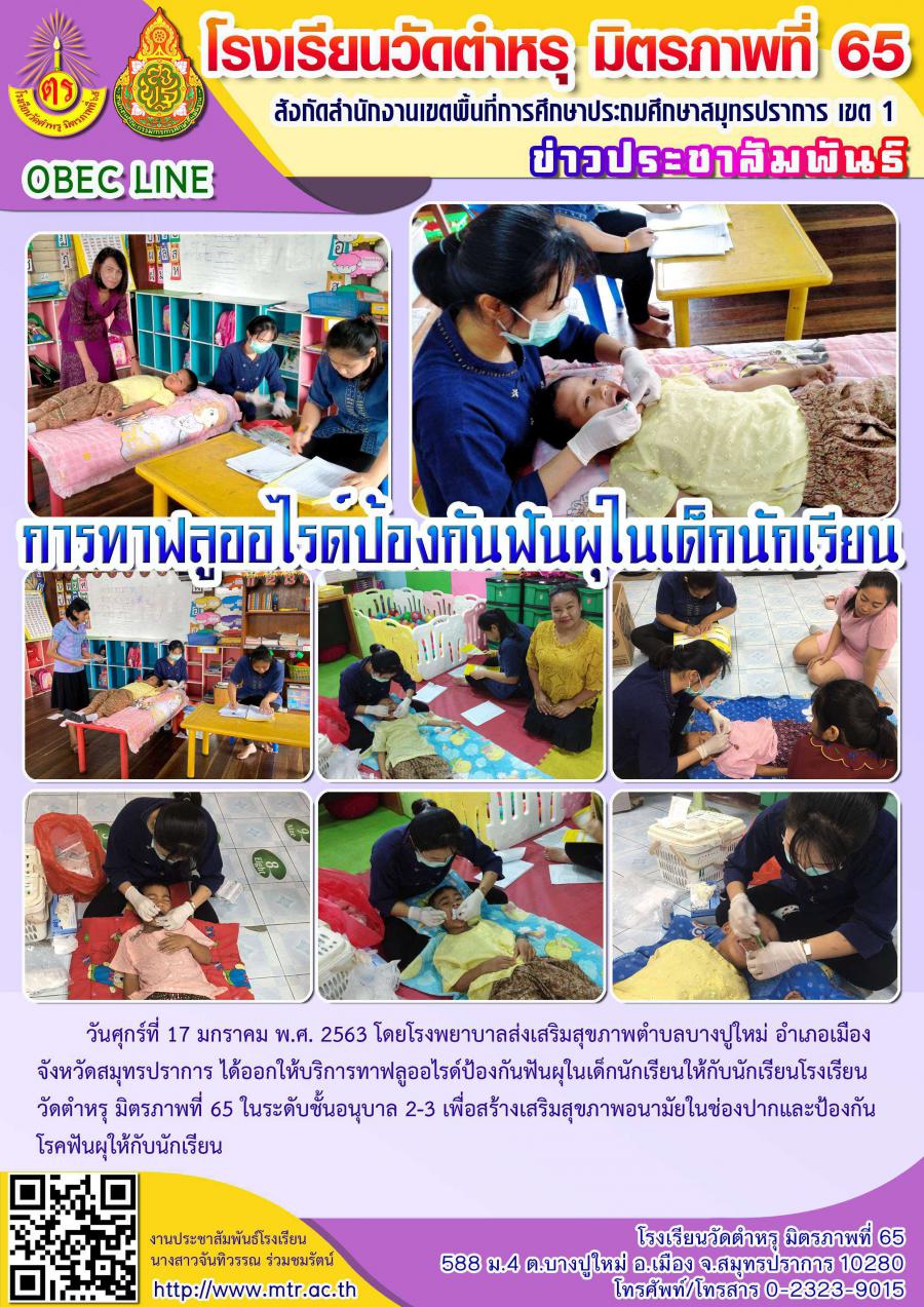 วันศุกร์ที่ 17 มกราคม พ.ศ. 2563 โดยโรงพยาบาลส่งเสริมสุขภาพตำบลบางปูใหม่ อำเภอเมือง จังหวัดสมุทรปราการ ได้ออกให้บริการทาฟลูออไรด์ป้องกันฟันผุในเด็กนักเรียนให้กับนักเรียนโรงเรียนวัดตำหรุ มิตรภาพที่ 65 ในระดับชั้นอนุบาล 2-3 เพื่อสร้างเสริมสุขภาพอนามัยในช่องปากและป้องกันโรคฟันผุให้กับนักเรียน