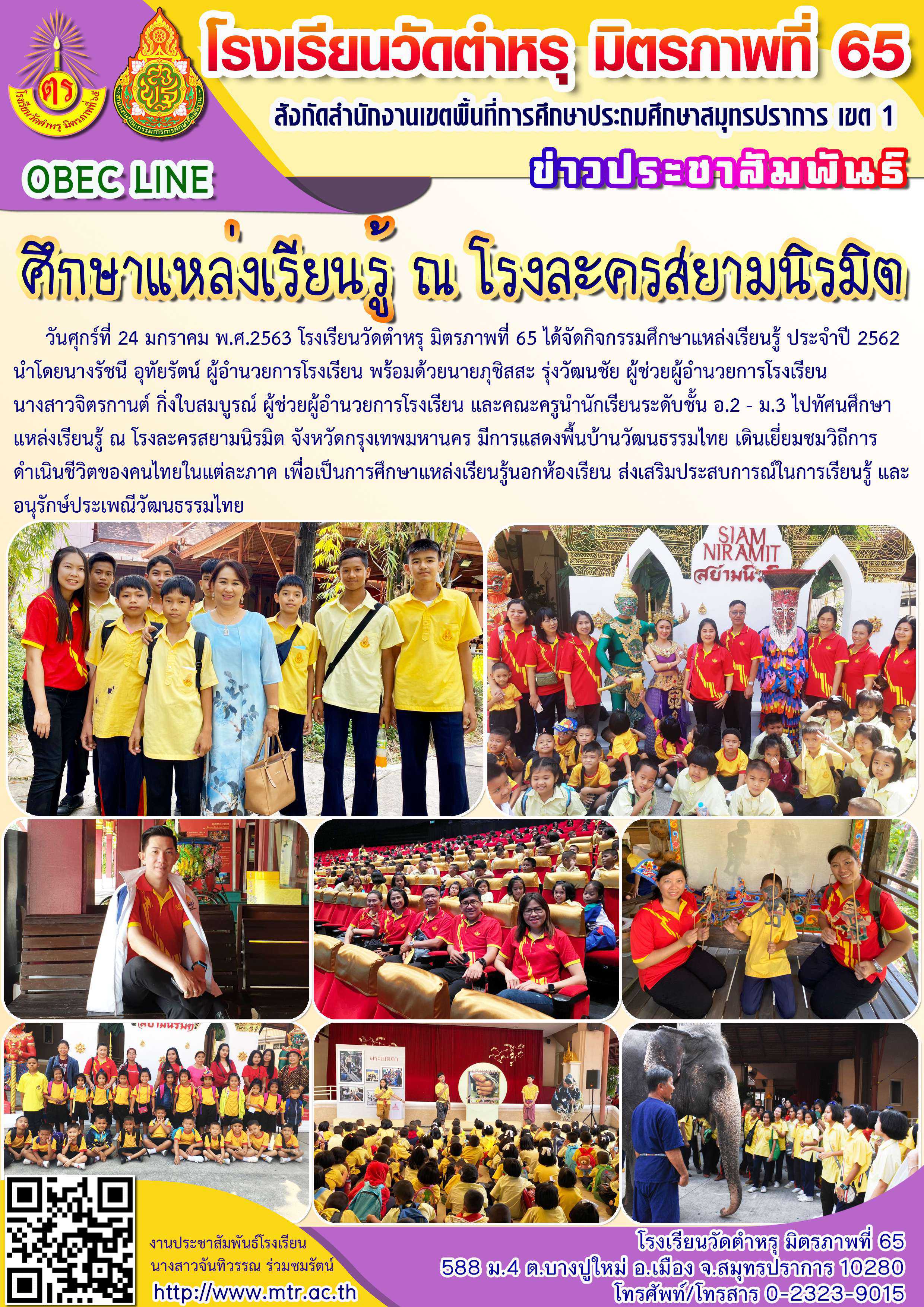 วันศุกร์ที่ 24 มกราคม พ.ศ.2563 โรงเรียนวัดตำหรุ มิตรภาพที่ 65 ได้จัดกิจกรรมศึกษาแหล่งเรียนรู้ ประจำปี 2562 นำโดยนางรัชนี อุทัยรัตน์ ผู้อำนวยการโรงเรียน พร้อมด้วยนายภุชิสสะ รุ่งวัฒนชัย ผู้ช่วยผู้อำนวยการโรงเรียน นางสาวจิตรกานต์ กิ่งใบสมบูรณ์ ผู้ช่วยผู้อำนวยการโรงเรียน และคณะครูนำนักเรียนระดับชั้น อ.2 - ม.3 ไปทัศนศึกษา แหล่งเรียนรู้ ณ โรงละครสยามนิรมิต จังหวัดกรุงเทพมหานคร มีการแสดงพื้นบ้านวัฒนธรรมไทย เดินเยี่ยมชมวิถีการ ดำเนินชีวิตของคนไทยในแต่ละภาค เพื่อเป็นการศึกษาแหล่งเรียนรู้นอกห้องเรียน ส่งเสริมประสบการณ์ในการเรียนรู้ และ อนุรักษ์ประเพณีวัฒนธรรมไทย