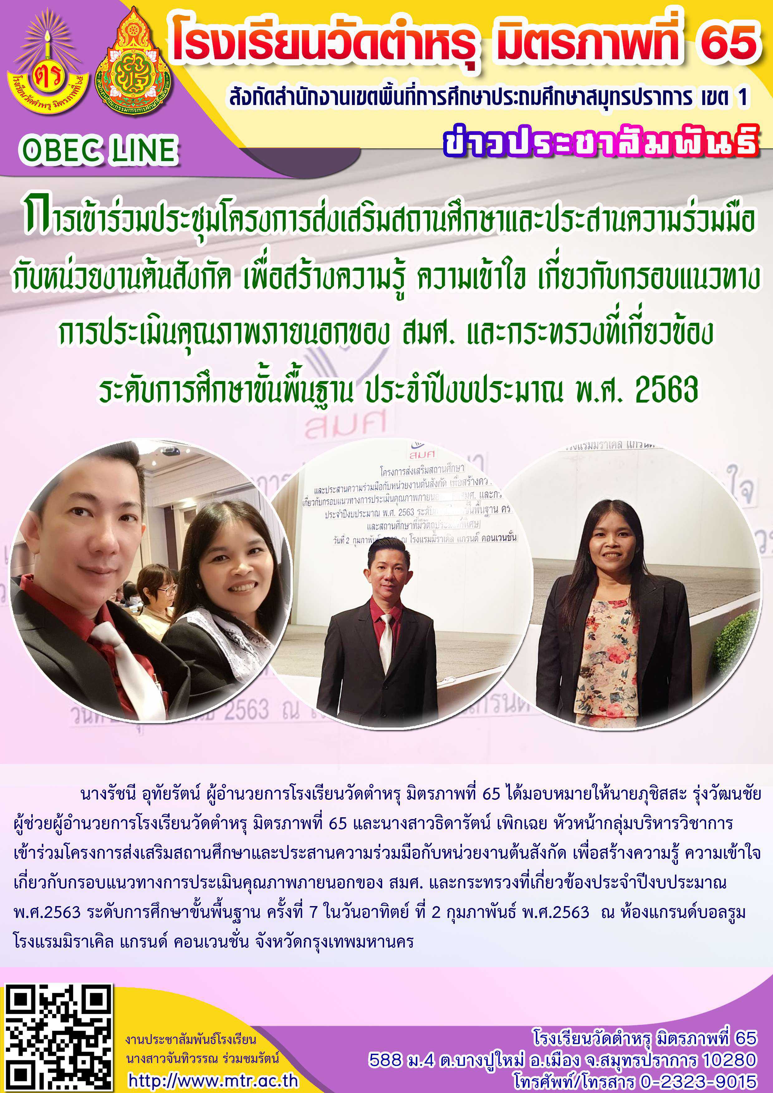 นางรัชนี อุทัยรัตน์ ผู้อำนวยการโรงเรียนวัดตำหรุ มิตรภาพที่ 65 ได้มอบหมายให้นายภุชิสสะ รุ่งวัฒนชัย ผู้ช่วยผู้อำนวยการโรงเรียนวัดตำหรุ มิตรภาพที่ 65 และนางสาวธิดารัตน์ เพิกเฉย หัวหน้ากลุ่มบริหารวิชาการ เข้าร่วมโครงการส่งเสริมสถานศึกษาและประสานความร่วมมือกับหน่วยงานต้นสังกัด เพื่อสร้างความรู้ ความเข้าใจ เกี่ยวกับกรอบแนวทางการประเมินคุณภาพภายนอกของ สมศ. และกระทรวงที่เกี่ยวข้องประจำปีงบประมาณ พ.ศ.2563 ระดับการศึกษาขั้นพื้นฐาน ครั้งที่ 7 ในวันอาทิตย์ ที่ 2 กุมภาพันธ์ พ.ศ.2563 ณ ห้องแกรนด์บอลรูม โรงแรมมิราเคิล แกรนด์ คอนเวนชั่น จังหวัดกรุงเทพมหานคร