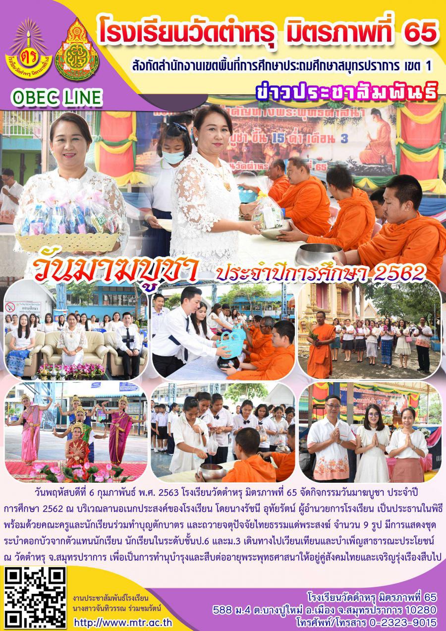 วันพฤหัสบดีที่ 6 กุมภาพันธ์ พ.ศ. 2563 โรงเรียนวัดตำหรุ มิตรภาพที่ 65 จัดกิจกรรมวันมาฆบูชา ประจำปีการศึกษา 2562 ณ บริเวณลานอเนกประสงค์ของโรงเรียน โดยนางรัชนี อุทัยรัตน์ ผู้อำนวยการโรงเรียน เป็นประธานในพิธี พร้อมด้วยคณะครูและนักเรียนร่วมทำบุญตักบาตร และถวายจตุปัจจัยไทยธรรมแด่พระสงฆ์ จำนวน 9 รูป มีการแสดงชุดระบำดอกบัวจากตัวแทนนักเรียน นักเรียนในระดับชั้นป.6 และม.3 เดินทางไปเวียนเทียนและบำเพ็ญสาธารณะประโยชน์ ณ วัดตำหรุ จ.สมุทรปราการ เพื่อเป็นการทำนุบำรุงและสืบต่ออายุพระพุทธศาสนาให้อยู่คู่สังคมไทยและเจริญรุ่งเรืองสืบไป