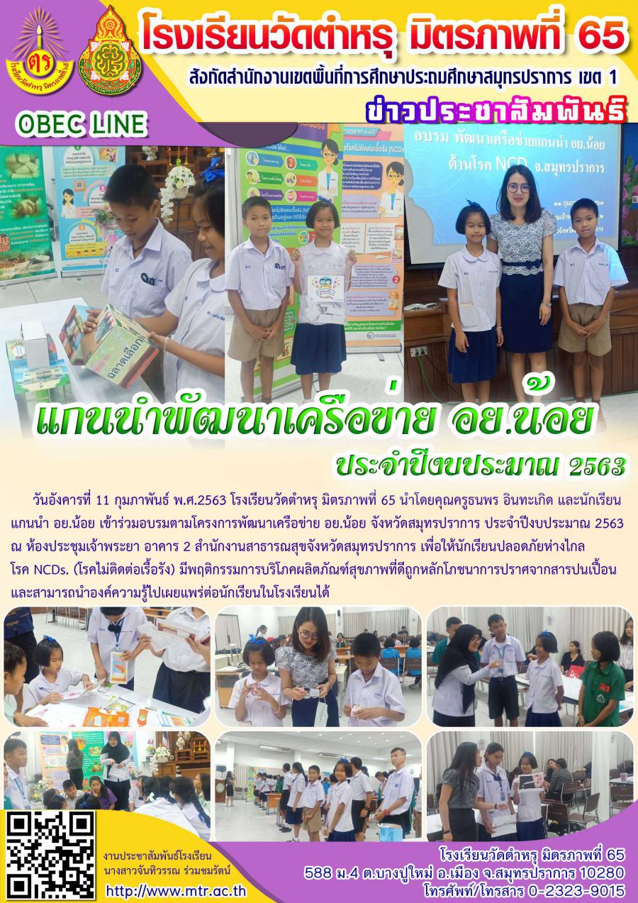 วันอังคารที่ 11 กุมภาพันธ์ พ.ศ.2563 โรงเรียนวัดตำหรุ มิตรภาพที่ 65 นำโดยคุณครูธนพร อินทะเกิด และนักเรียน แกนนำ อย.น้อย เข้าร่วมอบรมตามโครงการพัฒนาเครือข่าย อย.น้อย จังหวัดสมุทรปราการ ประจำปีงบประมาณ 2563 ณ ห้องประชุมเจ้าพระยา อาคาร 2 สำนักงานสาธารณสุขจังหวัดสมุทรปราการ เพื่อให้นักเรียนปลอดภัยห่างไกล โรค NCDs. (โรคไม่ติดต่อเรื้อรัง) มีพฤติกรรมการบริโภคผลิตภัณฑ์สุขภาพที่ดีถูกหลักโภชนาการปราศจากสารปนเปื้อน และสามารถนำองค์ความรู้ไปเผยแพร่ต่อนักเรียนในโรงเรียนได้