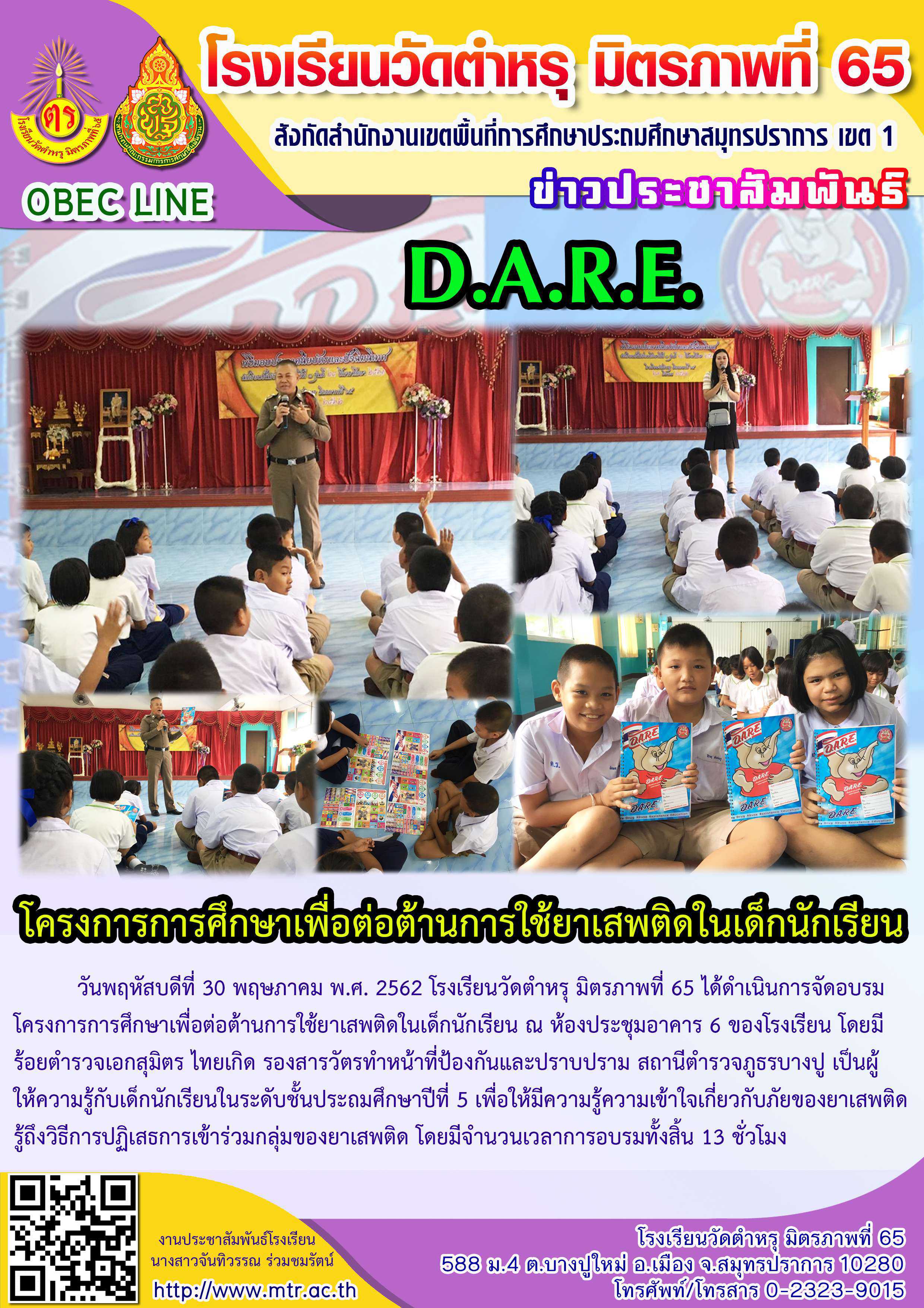 วันพฤหัสบดีที่ 30 พฤษภาคม พ.ศ. 2562 โรงเรียนวัดตำหรุ มิตรภาพที่ 65 ได้ดำเนินการจัดอบรม โครงการการศึกษาเพื่อต่อต้านการใช้ยาเสพติดในเด็กนักเรียน ณ ห้องประชุมอาคาร 6 ของโรงเรียน โดยมี ร้อยตำรวจเอกสุมิตร ไทยเกิด รองสารวัตรทำหน้าที่ป้องกันและปราบปราม สถานีตำรวจภูธรบางปู เป็นผู้ ให้ความรู้กับเด็กนักเรียนในระดับชั้นประถมศึกษาปีที่ 5 เพื่อให้มีความรู้ความเข้าใจเกี่ยวกับภัยของยาเสพติด รู้ถึงวิธีการปฏิเสธการเข้าร่วมกลุ่มของยาเสพติด โดยมีจำนวนเวลาการอบรมทั้งสิ้น 13 ชั่วโมง