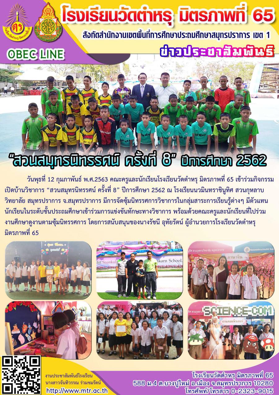 วันพุธที่ 12 กุมภาพันธ์ พ.ศ.2563 คณะครูและนักเรียนโรงเรียนวัดตำหรุ มิตรภาพที่ 65 เข้าร่วมกิจกรรม เปิดบ้านวิชาการ สวนสมุทรนิทรรศน์ ครั้งที่ 8 ปีการศึกษา 2562 ณ โรงเรียนนวมินทราชินูทิศ สวนกุหลาบ วิทยาลัย สมุทรปราการ จ.สมุทรปราการ มีการจัดซุ้มนิทรรศการวิชาการในกลุ่มสาระการเรียนรู้ต่างๆ มีตัวแทน นักเรียนในระดับชั้นประถมศึกษาเข้าร่วมการแข่งขันทักษะทางวิชาการ พร้อมด้วยคณะครูและนักเรียนที่ไปร่วม งานศึกษาดูงานตามซุ้มนิทรรศการ โดยการสนับสนุนของนางรัชนี อุทัยรัตน์ ผู้อำนวยการโรงเรียนวัดตำหรุ มิตรภาพที่ 65