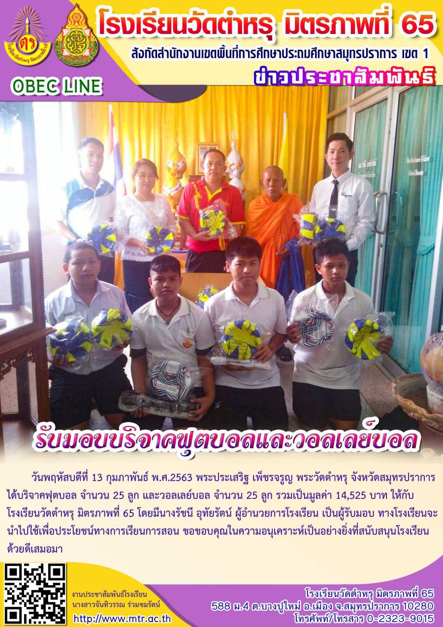 วันพฤหัสบดีที่ 13 กุมภาพันธ์ พ.ศ.2563 พระประเสริฐ เพ็ชรจรูญ พระวัดตำหรุ จังหวัดสมุทรปราการ ได้บริจาคฟุตบอล จำนวน 25 ลูก และวอลเลย์บอล จำนวน 25 ลูก รวมเป็นมูลค่า 14,525 บาท ให้กับโรงเรียนวัดตำหรุ มิตรภาพที่ 65 โดยมีนางรัชนี อุทัยรัตน์ ผู้อำนวยการโรงเรียน เป็นผู้รับมอบ ทางโรงเรียนจะนำไปใช้เพื่อประโยชน์ทางการเรียนการสอน ขอขอบคุณในความอนุเคราะห์เป็นอย่างยิ่งที่สนับสนุนโรงเรียนด้วยดีเสมอมา
