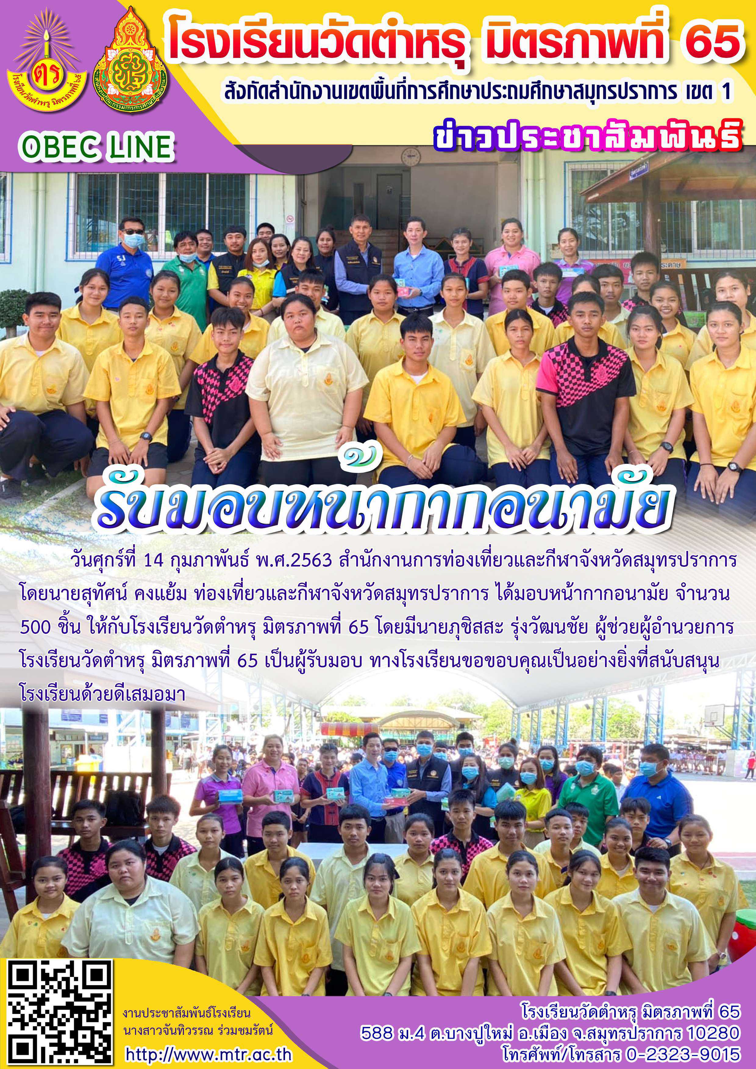 วันศุกร์ที่ 14 กุมภาพันธ์ พ.ศ.2563 สำนักงานการท่องเที่ยวและกีฬาจังหวัดสมุทรปราการ โดยนายสุทัศน์ คงแย้ม ท่องเที่ยวและกีฬาจังหวัดสมุทรปราการ ได้มอบหน้ากากอนามัย จำนวน 500 ชิ้น ให้กับโรงเรียนวัดตำหรุ มิตรภาพที่ 65 โดยมีนายภุชิสสะ รุ่งวัฒนชัย ผู้ช่วยผู้อำนวยการโรงเรียนวัดตำหรุ มิตรภาพที่ 65 เป็นผู้รับมอบ ทางโรงเรียนขอขอบคุณเป็นอย่างยิ่งที่สนับสนุนโรงเรียนด้วยดีเสมอมา