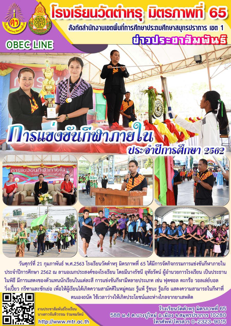 วันศุกร์ที่ 21 กุมภาพันธ์ พ.ศ.2563 โรงเรียนวัดตำหรุ มิตรภาพที่ 65 ได้มีการจัดกิจกรรมการแข่งขันกีฬาภายใน ประจำปีการศึกษา 2562 ณ ลานอเนกประสงค์ของโรงเรียน โดยมีนางรัชนี อุทัยรัตน์ ผู้อำนวยการโรงเรียน เป็นประธานในพิธี มีการแสดงของตัวแทนนักเรียนในแต่ละสี การแข่งขันกีฬามีหลายประเภท เช่น ฟุตซอล ตะกร้อ วอลเล่ย์บอล วิ่งเปี้ยว กรีฑาและชักเย่อ เพื่อให้ผู้เรียนได้เกิดความสามัคคีในหมู่คณะ รู้แพ้ รู้ชนะ รู้อภัย แสดงความสามารถในกีฬาที่ตนเองถนัด ใช้เวลาว่างให้เกิดประโยชน์และห่างไกลจากยาเสพติด