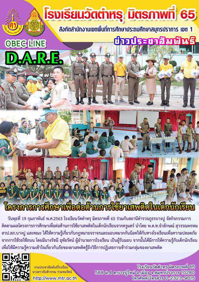 วันพุธที่ 19 กุมภาพันธ์ พ.ศ.2563 โรงเรียนวัดตำหรุ มิตรภาพที่ 65 ร่วมกับสถานีตำรวจภูธรบางปู จัดกิจกรรมการติดตามผลโครงการการศึกษาเพื่อต่อต้านการใช้ยาเสพติดในเด็กนักเรียนจากครูแดร์ นำโดย พ.ต.ท.จำลักษณ์ สุวรรณพรหม สวป.สภ.บางปู และคณะ ได้ให้ความรู้เกี่ยวกับกฎหมายจราจรและมอบหมวกกันน็อคให้กับทางโรงเรียนเพื่อความปลอดภัยจากการใช้รถใช้ถนน โดยมีนางรัชนี อุทัยรัตน์ ผู้อำนวยการโรงเรียน เป็นผู้รับมอบ จากนั้นได้มีการให้ความรู้กับเด็กนักเรียนเพื่อให้มีความรู้ความเข้าใจเกี่ยวกับภัยของยาเสพติดรู้ถึงวิธีการปฏิเสธการเข้าร่วมกลุ่มของยาเสพติด
