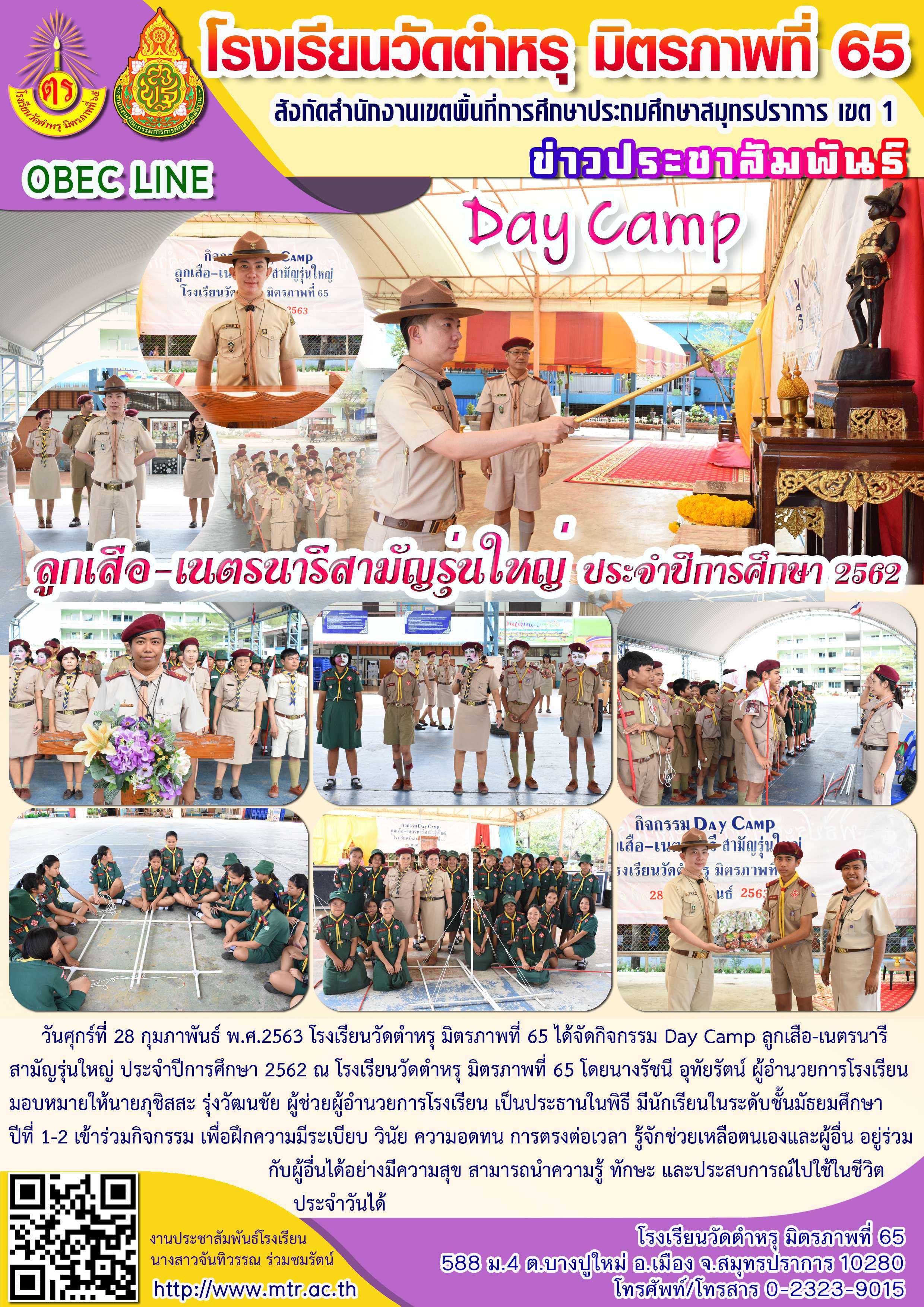 วันศุกร์ที่ 28 กุมภาพันธ์ พ.ศ.2563 โรงเรียนวัดตำหรุ มิตรภาพที่ 65 ได้จัดกิจกรรม Day Camp ลูกเสือ-เนตรนารี สามัญรุ่นใหญ่ ประจำปีการศึกษา 2562 ณ โรงเรียนวัดตำหรุ มิตรภาพที่ 65 โดยนางรัชนี อุทัยรัตน์ ผู้อำนวยการโรงเรียน มอบหมายให้นายภุชิสสะ รุ่งวัฒนะชัย ผู้ช่วยผู้อำนวยการโรงเรียน เป็นประธานในพิธี มีนักเรียนในระดับชั้นมัธยมศึกษา ปีที่ 1-2 เข้าร่วมกิจกรรม เพื่อฝึกความมีระเบียบ วินัย ความอดทน การตรงต่อเวลา รู้จักช่วยเหลือตนเองและผู้อื่น อยู่ร่วมกับผู้อื่นได้อย่างมีความสุข สามารถนำความรู้ ทักษะ และประสบการณ์ไปใช้ในชีวิตประจำวันได้