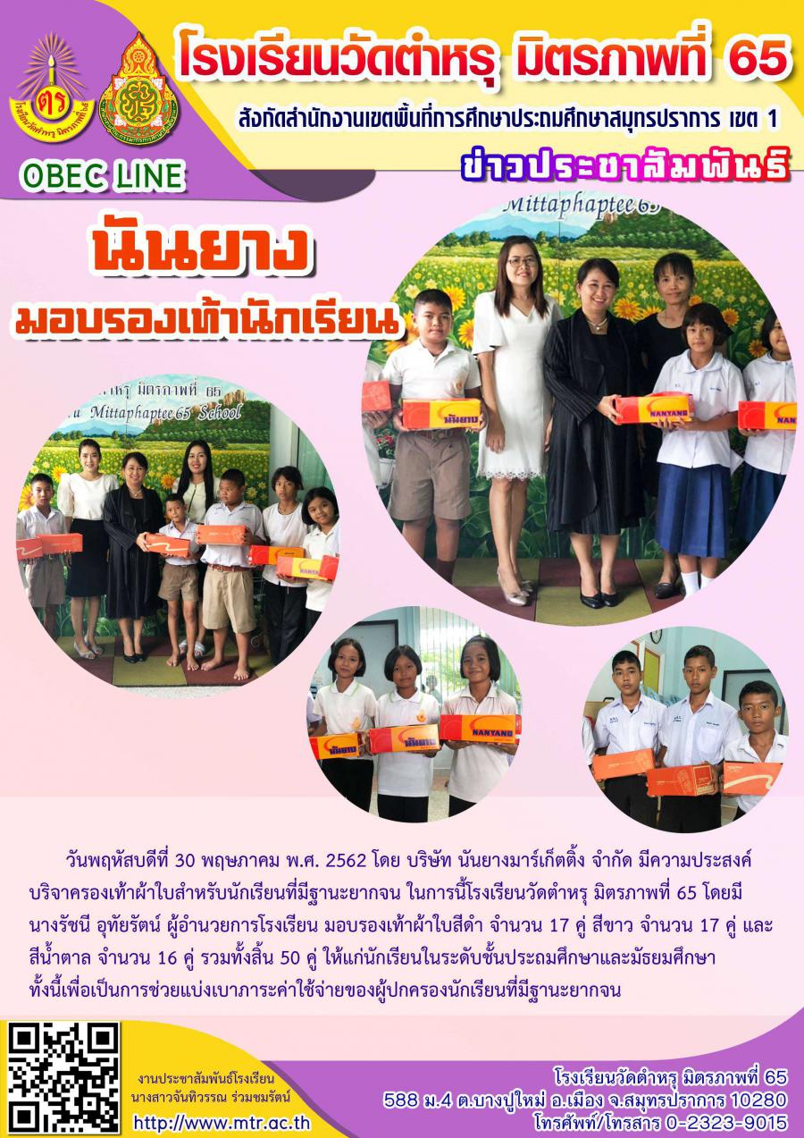 วันพฤหัสบดีที่ 30 พฤษภาคม พ.ศ. 2562 โดย บริษัท นันยางมาร์เก็ตติ้ง จำกัด มีความประสงค์ บริจาครองเท้าผ้าใบสำหรับนักเรียนที่มีฐานะยากจน ในการนี้โรงเรียนวัดตำหรุ มิตรภาพที่ 65 โดยมี นางรัชนี อุทัยรัตน์ ผู้อำนวยการโรงเรียน มอบรองเท้าผ้าใบสีดำ จำนวน 17 คู่ สีขาว จำนวน 17 คู่ และ สีน้ำตาล จำนวน 16 คู่ รวมทั้งสิ้น 50 คู่ ให้แก่นักเรียนในระดับชั้นประถมศึกษาและมัธยมศึกษา ทั้งนี้เพื่อเป็นการช่วยแบ่งเบาภาระค่าใช้จ่ายของผู้ปกครองนักเรียนที่มีฐานะยากจน