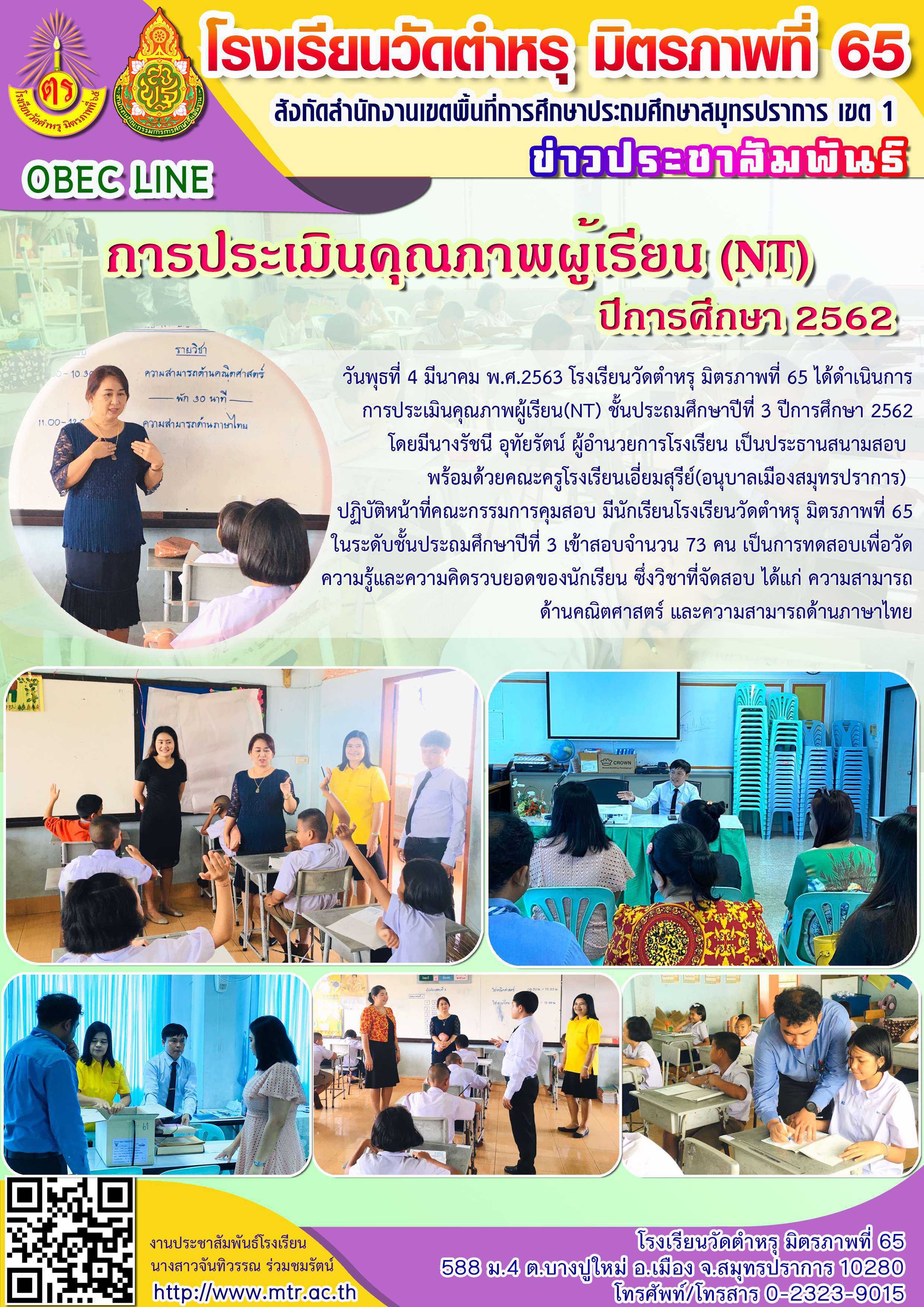 วันพุธที่ 4 มีนาคม พ.ศ.2563 โรงเรียนวัดตำหรุ มิตรภาพที่ 65 ได้ดำเนินการ การประเมินคุณภาพผู้เรียน(NT) ชั้นประถมศึกษาปีที่ 3 ปีการศึกษา 2562 โดยมีนางรัชนี อุทัยรัตน์ ผู้อำนวยการโรงเรียน เป็นประธานสนามสอบ พร้อมด้วยคณะครูโรงเรียนเอี่ยมสุรีย์(อนุบาลเมืองสมุทรปราการ) ปฏิบัติหน้าที่คณะกรรมการคุมสอบ มีนักเรียนโรงเรียนวัดตำหรุ มิตรภาพที่ 65 ในระดับชั้นประถมศึกษาปีที่ 3 เข้าสอบจำนวน 73 คน เป็นการทดสอบเพื่อวัดความรู้และความคิดรวบยอดของนักเรียน ซึ่งวิชาที่จัดสอบ ได้แก่ ความสามารถด้านคณิตศาสตร์ และความสามารถด้านภาษาไทย