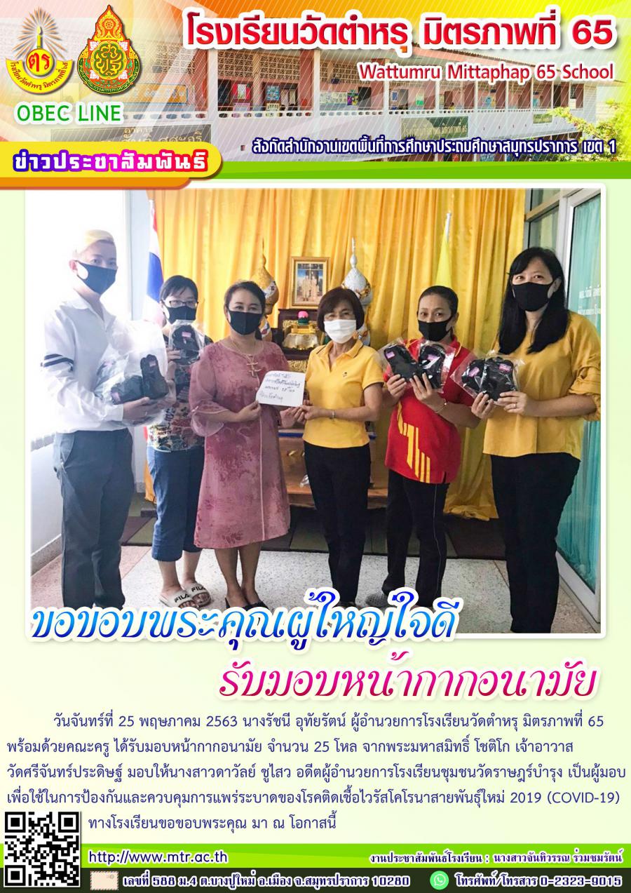 วันจันทร์ที่ 25 พฤษภาคม 2563 นางรัชนี อุทัยรัตน์ ผู้อำนวยการโรงเรียนวัดตำหรุ มิตรภาพที่ 65 พร้อมด้วยคณะครู ได้รับมอบหน้ากากอนามัย จำนวน 25 โหล จากพระมหาสมิทธิ์ โชติโก เจ้าอาวาสวัดศรีจันทร์ประดิษฐ์ มอบให้นางสาวดาวัลย์ ชูไสว อดีตผู้อำนวยการโรงเรียนชุมชนวัดราษฎร์บำรุง เป็นผู้มอบ เพื่อใช้ในการป้องกันและควบคุมการแพร่ระบาดของโรคติดเชื้อไวรัสโคโรนาสายพันธุ์ใหม่ 2019 (COVID-19) ทางโรงเรียนขอขอบพระคุณ มา ณ โอกาสนี้